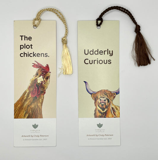 Bookmark w/ Chicken (Rooster) or Highland Cow Artwork | Double-Sided w/ Tassel & Funny Message