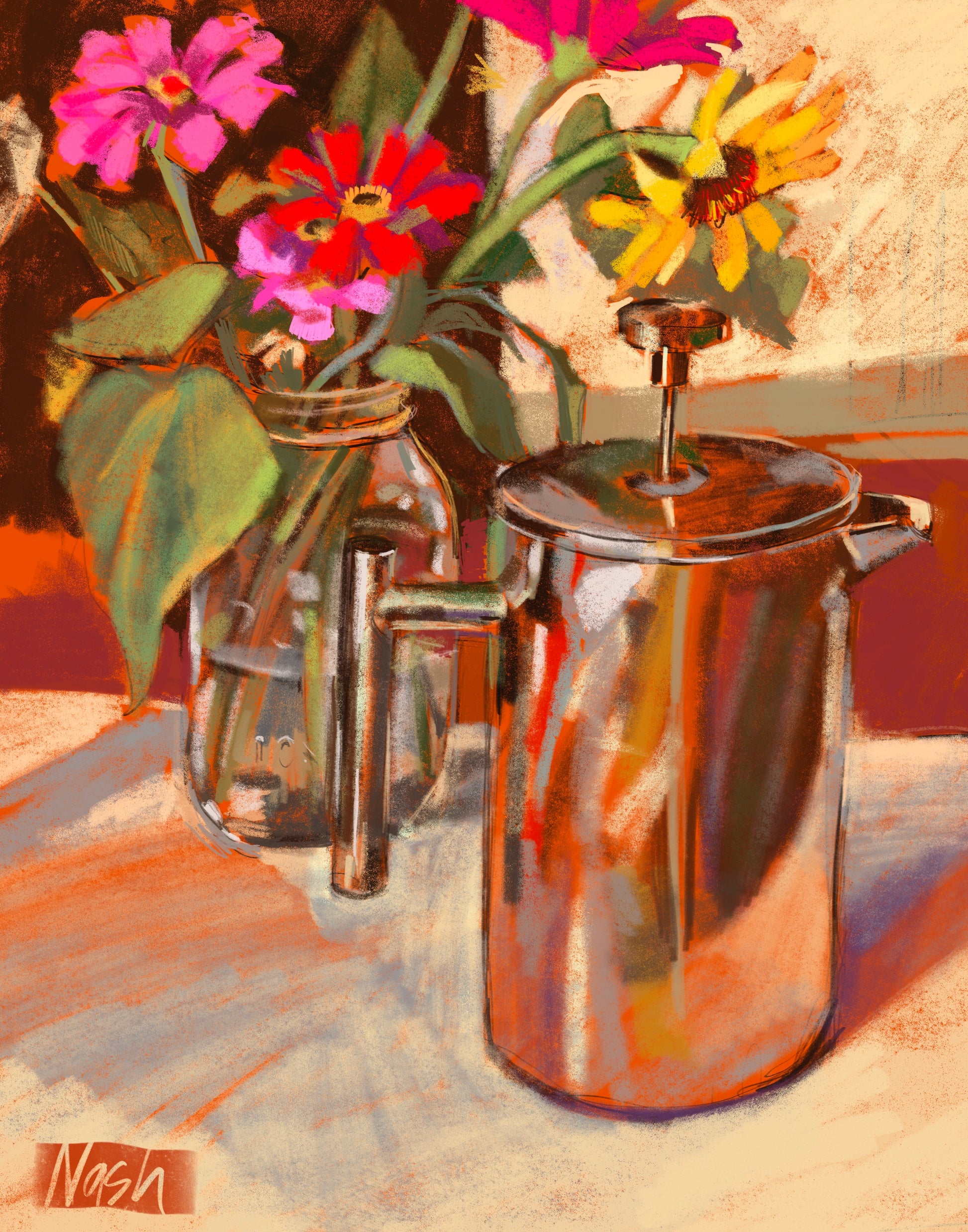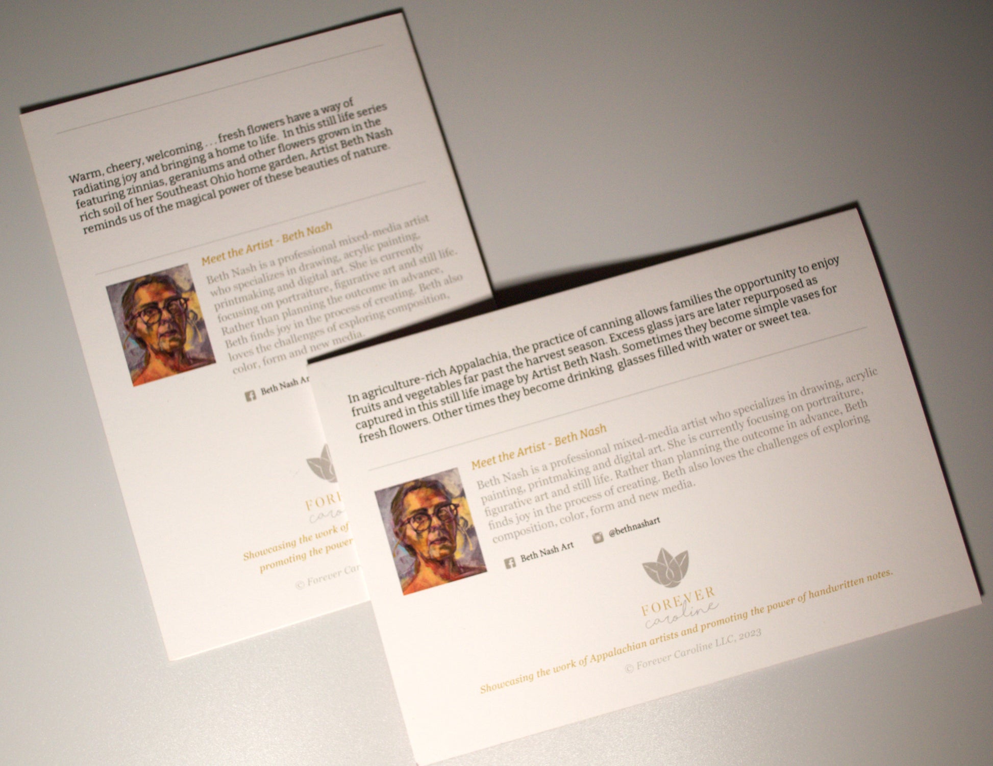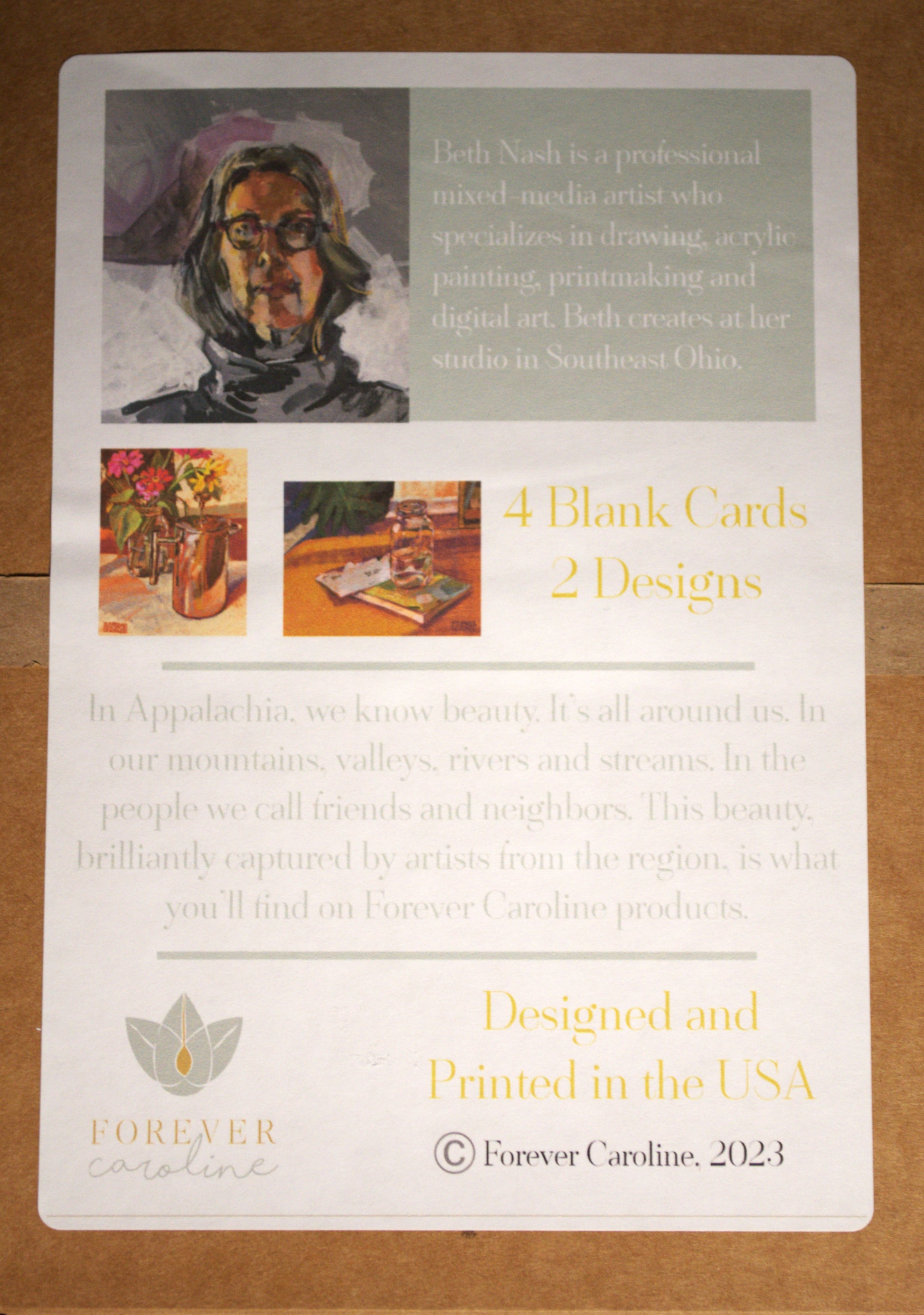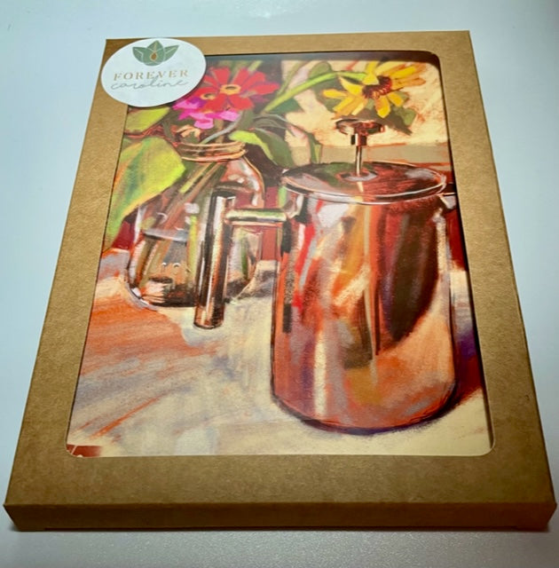Perfect for thank you, thinking of you, get well, birthday and friendship greetings, this set of traditional blank all-occasion notecards featuring the work of Artist Beth Nash perfectly illustrates the custom of repurposing and prolonging the life and usefulness of various kitchen items . . . a coffee pot serving as a vase and a canning jar serving as a drinking glass.