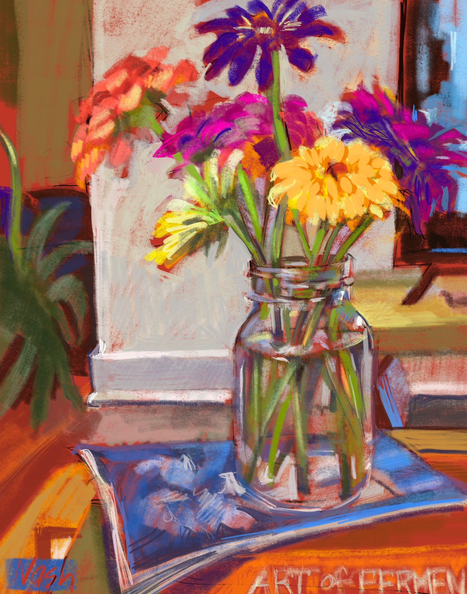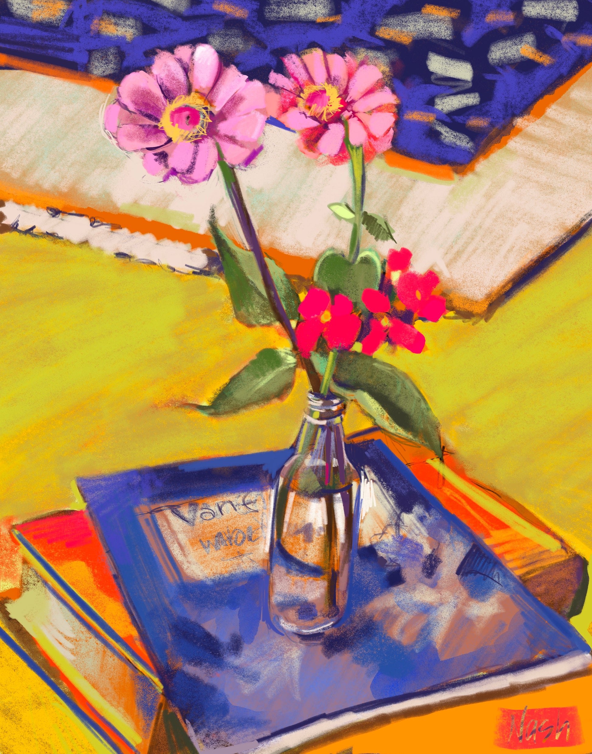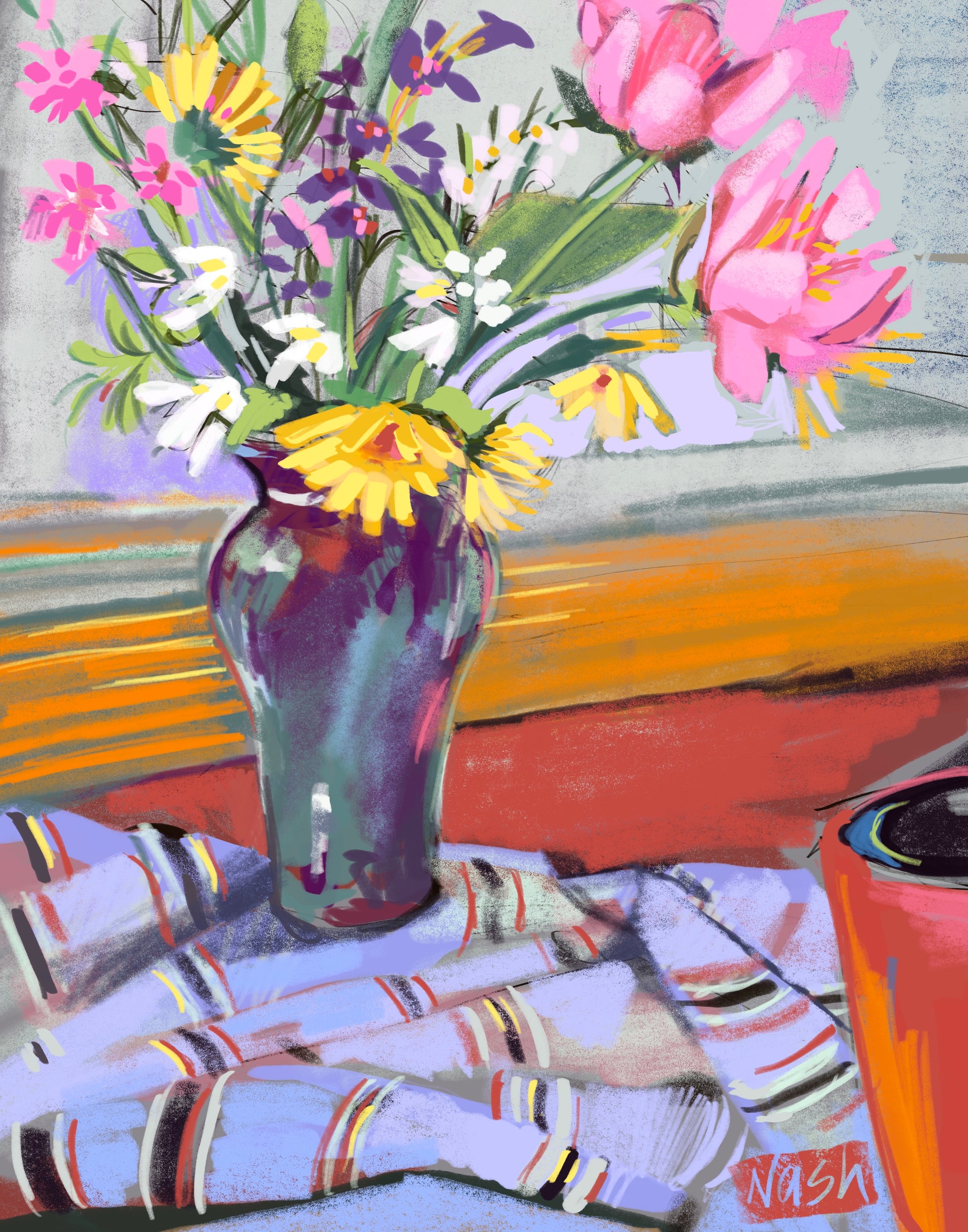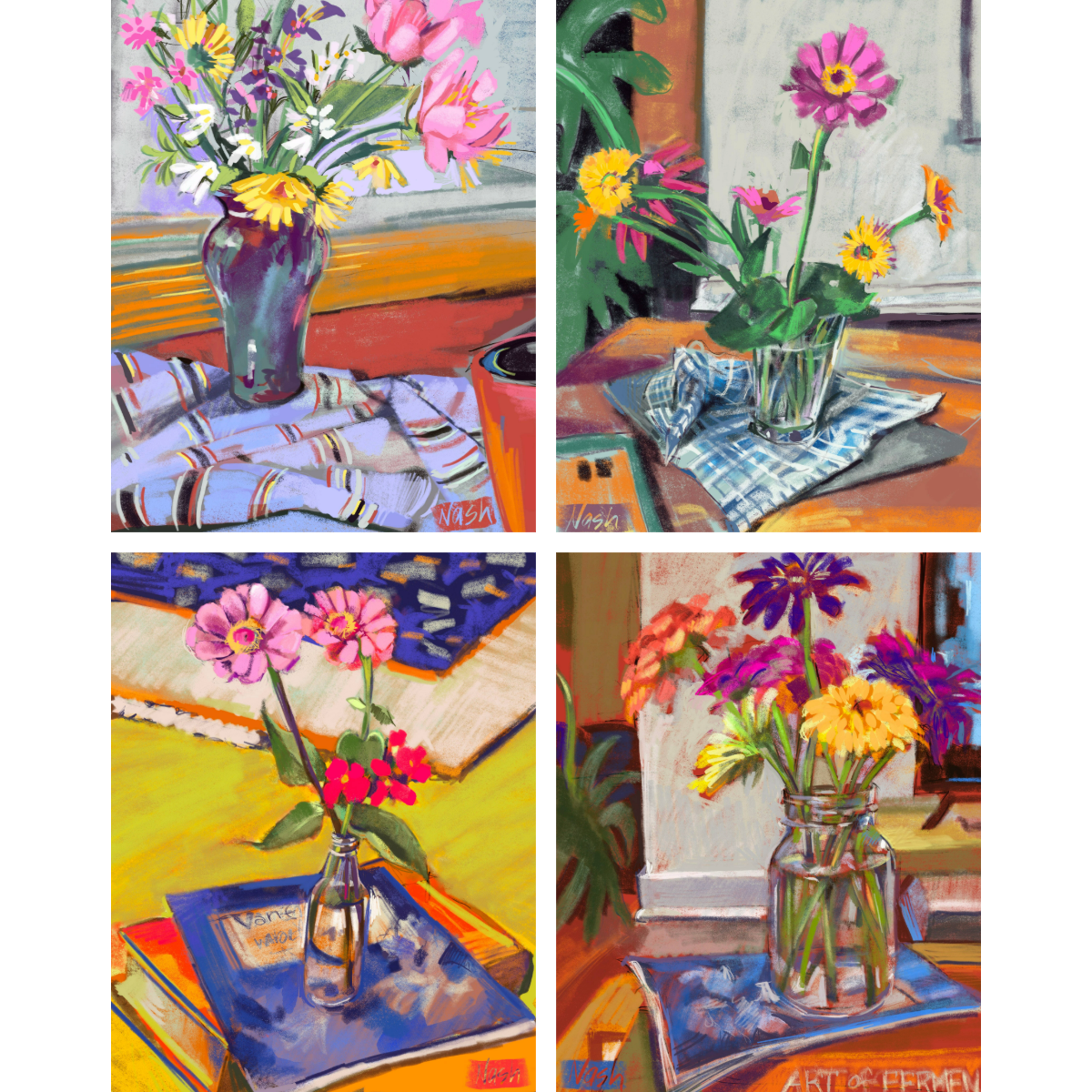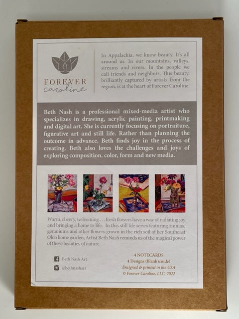Warm, cheery and welcoming, fresh flowers have a way of radiating joy . . . and that's why this boxed card set is perfect for thank you, thinking of you, get well, birthday and so many other messages of friendship! This four-card all-occasion blank notecard set features a still life series of zinnias, geraniums and other flowers grown in the rich soil of the garden of Artist Beth Nash.