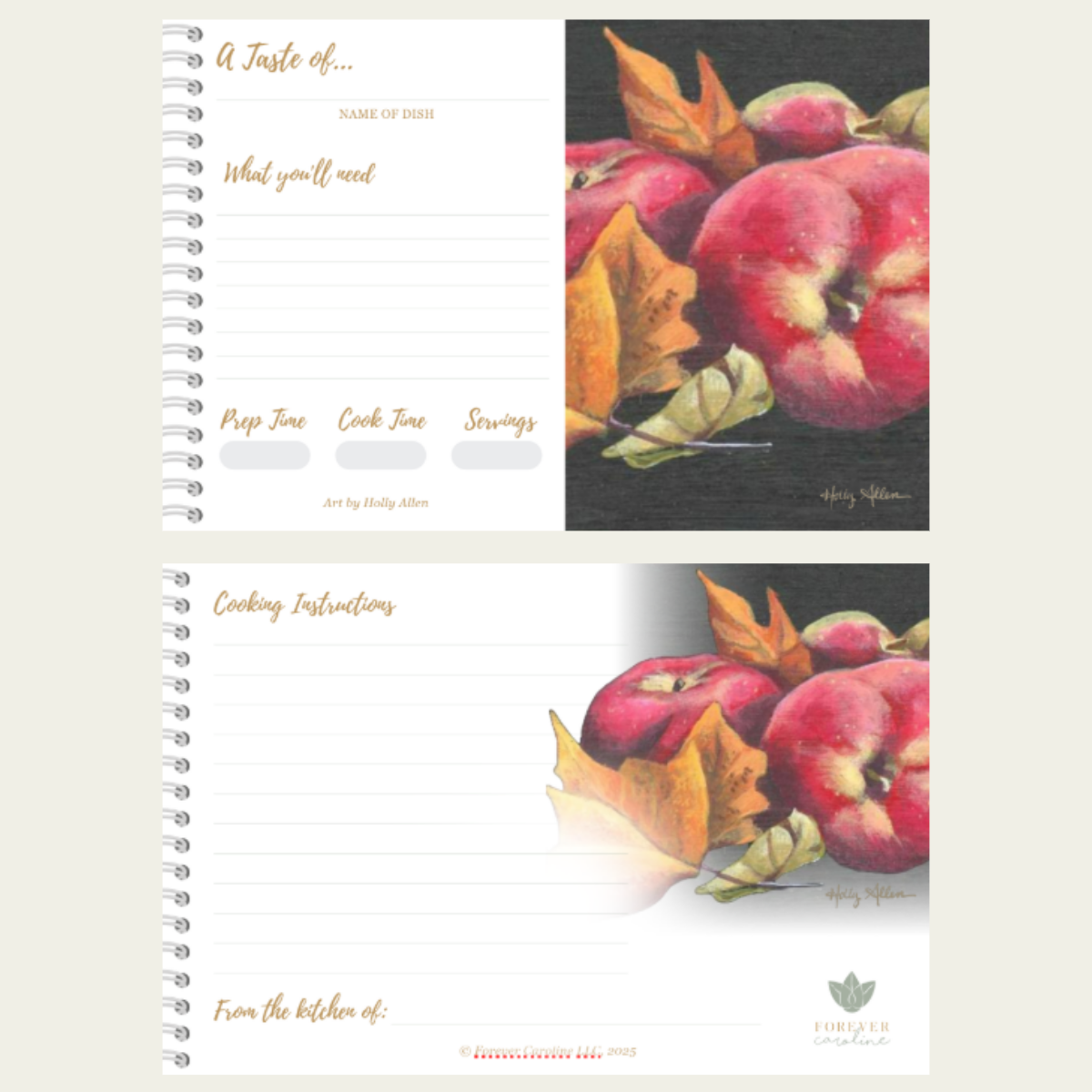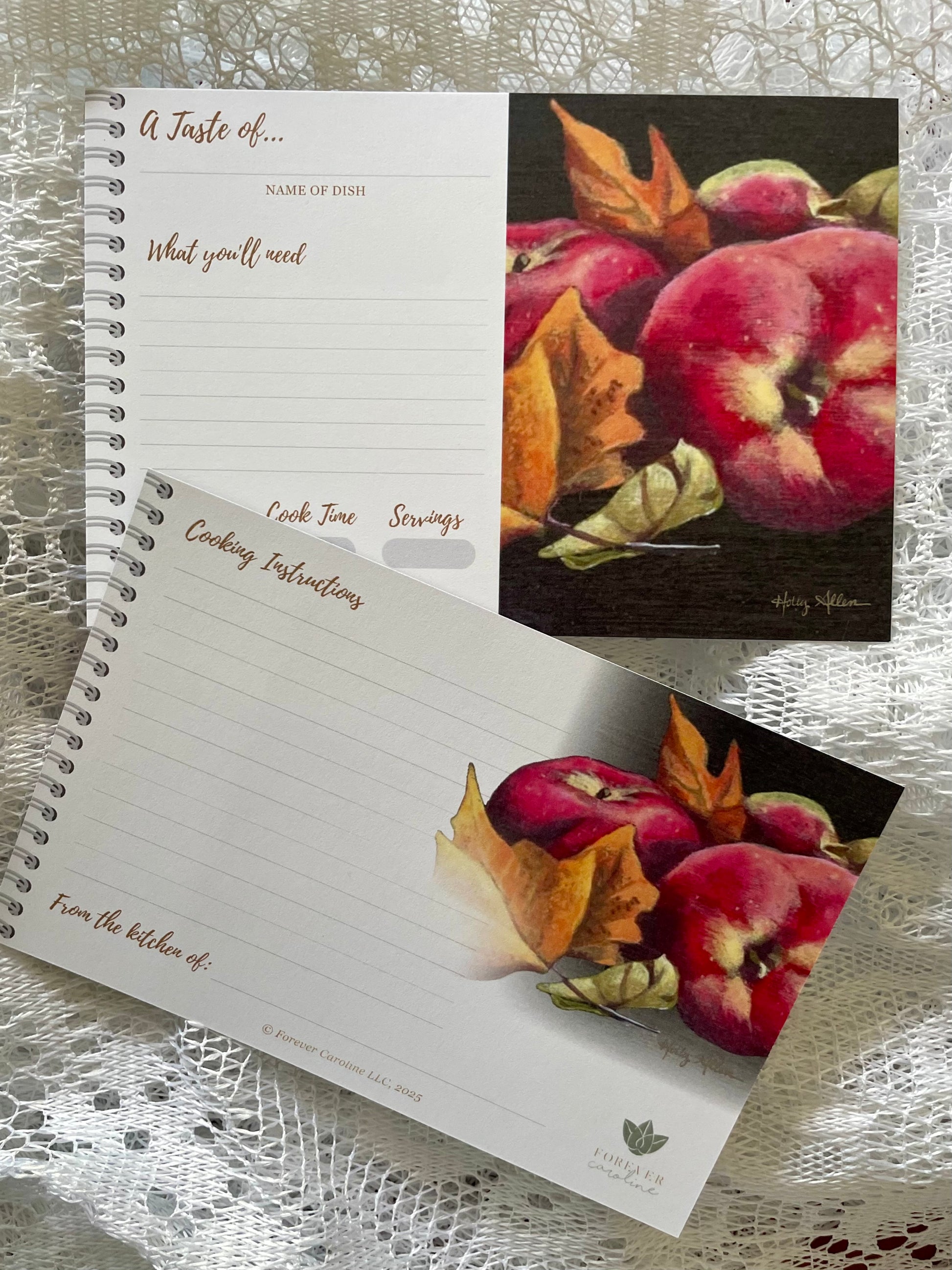 Bring the warmth of the harvest season to every handwritten recipe with our Autumn Harvest Apple Recipe Cards, featuring an original painting of ripe apples nestled among crisp fall leaves. These eight charming 4" X 6" two-sided cards blend rustic farmhouse style with seasonal beauty— perfect for holiday baking, Thanksgiving gifting, or heirloom recipe collections.