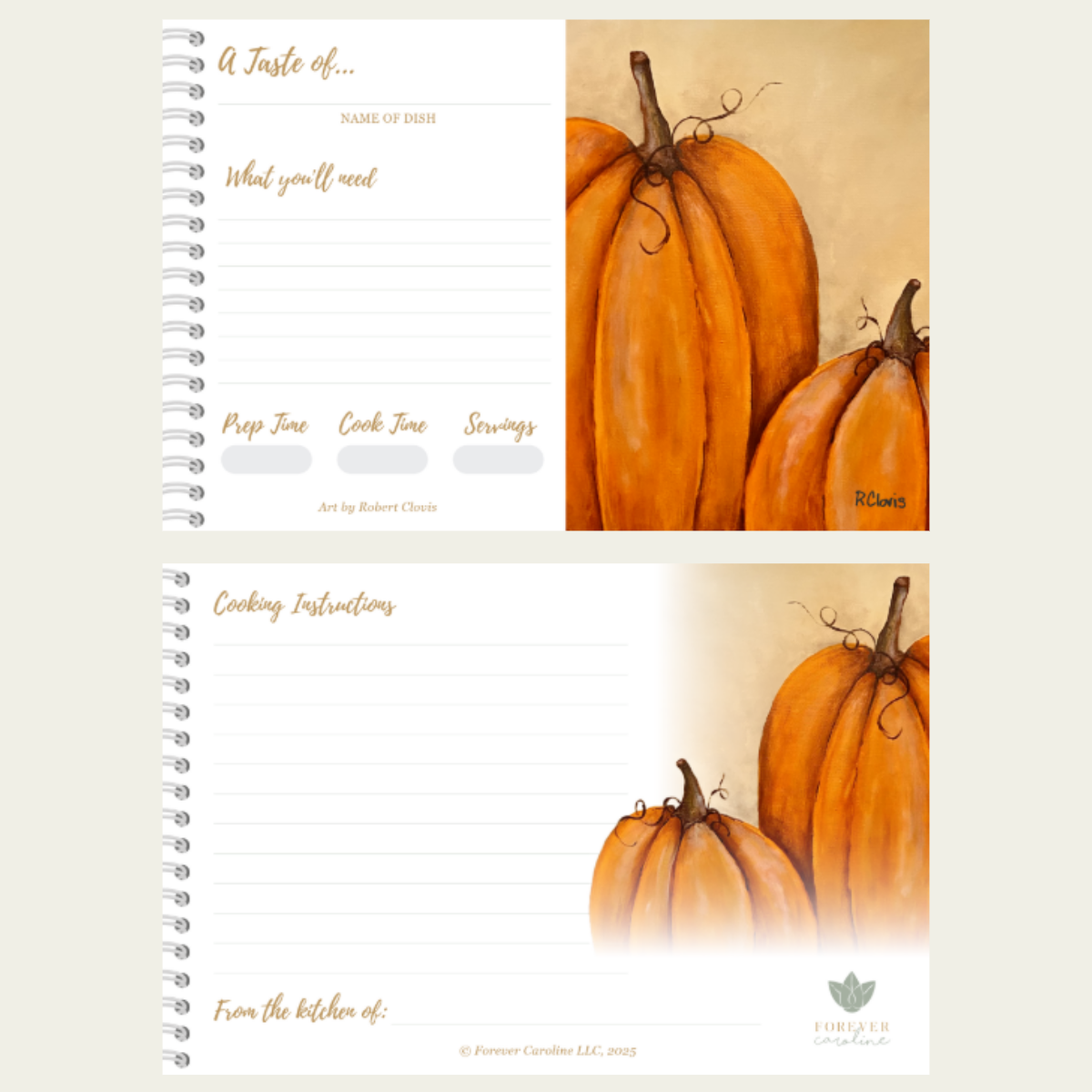 Bring the warmth of the Fall harvest season to every handwritten recipe with our Autumn Harvest Pumpkin Recipe Cards, featuring an original painting of whimsical pumpkins. These 8 charming two-sided 4" X 6" cards blend rustic farmhouse style with seasonal beauty — perfect for holiday baking, Thanksgiving gifting, or heirloom recipe collections.