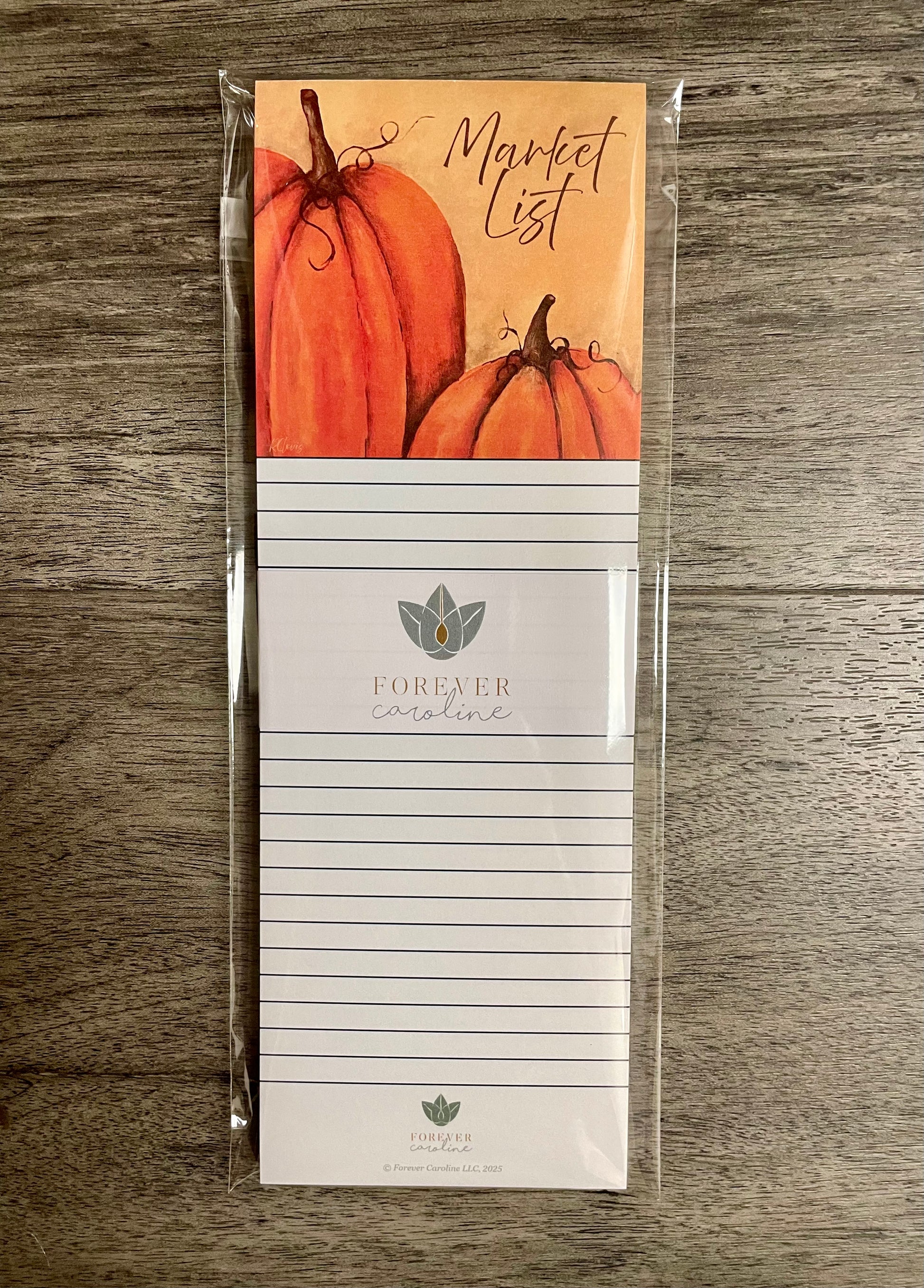 Hanging on the refrigerator with the included peel-and-stick magnet or sitting on your favorite desk or table, this generously-sized lined market list is designed to ensure that you can fully enjoy the featured image of rustic pumpkins reproduced from a painting by Artist Robert Clovis while also having plenty of room to make your list. It's a unique and perfect tablet for market and shopping lists, especially in the Fall!