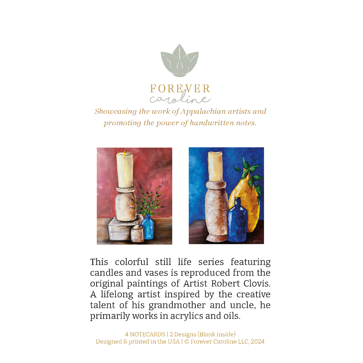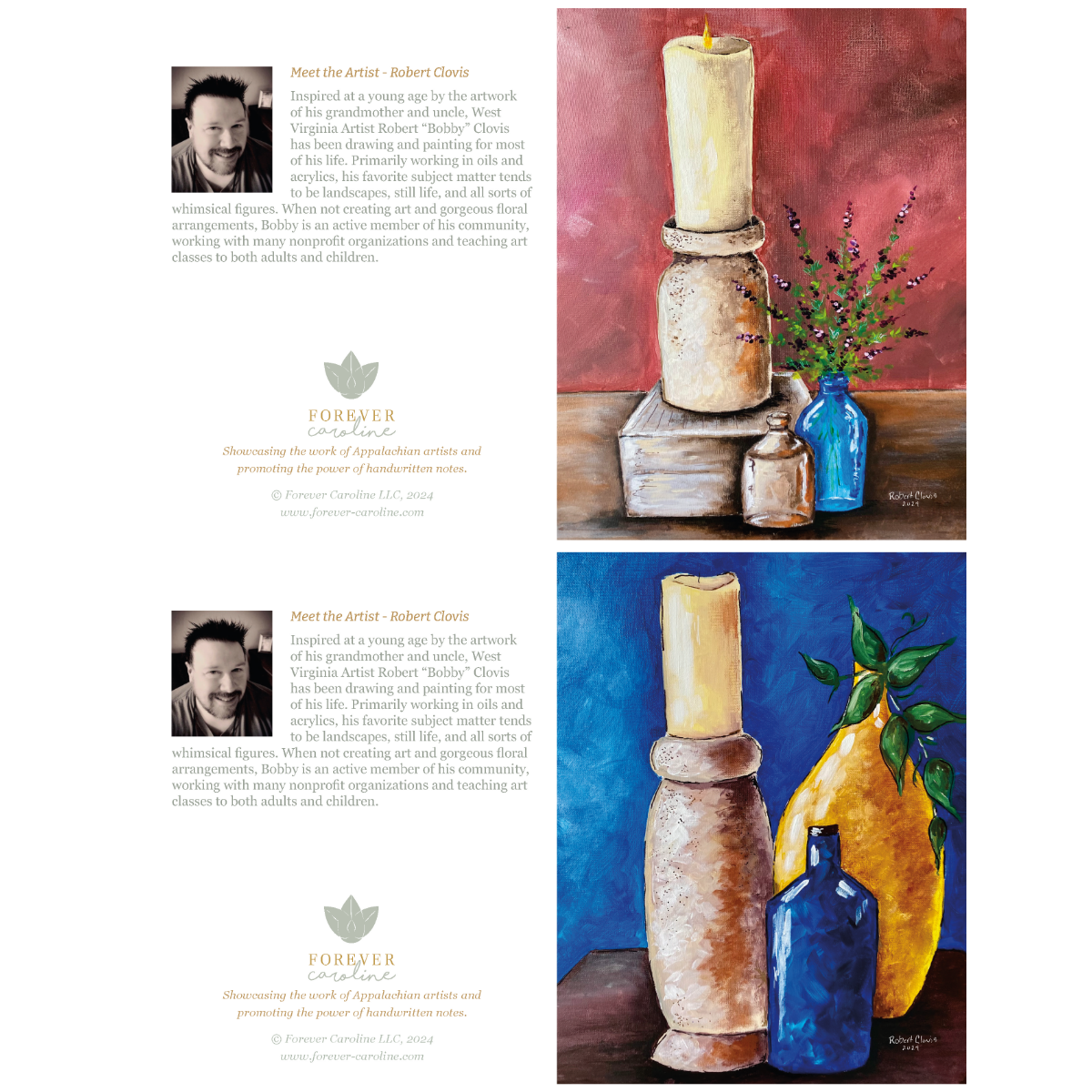 Bring timeless beauty to your correspondence with this exquisite 4-card set featuring original still life art with glowing and still candles and a variety of vases and stone jars. The original artwork in this set is reproduced from paintings by Artist Robert "Bobby" Clovis.