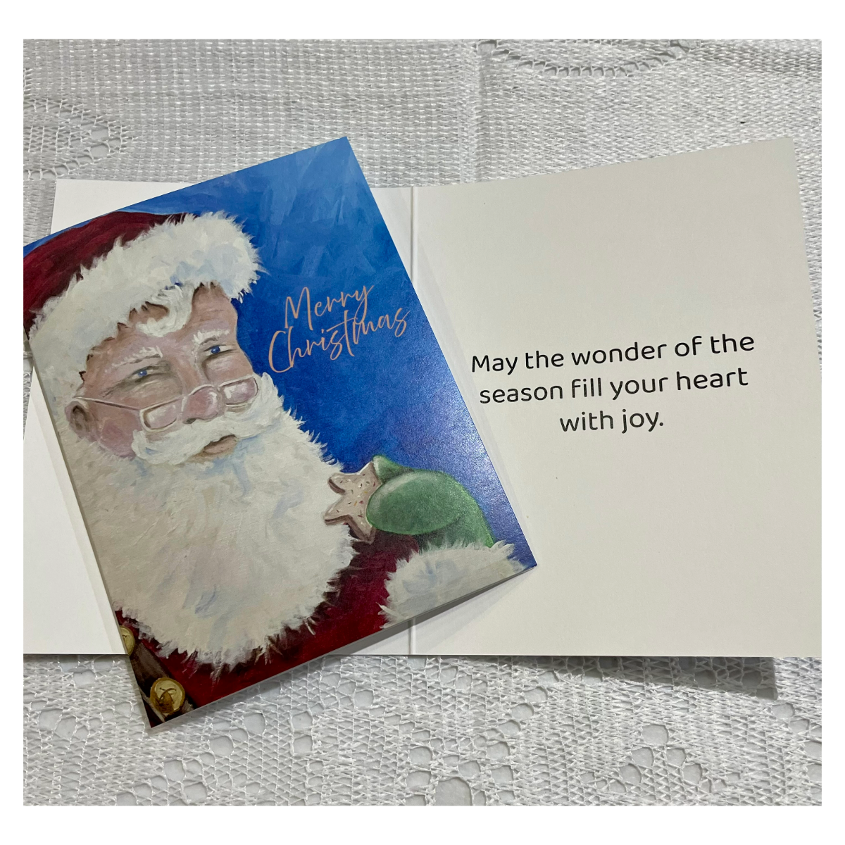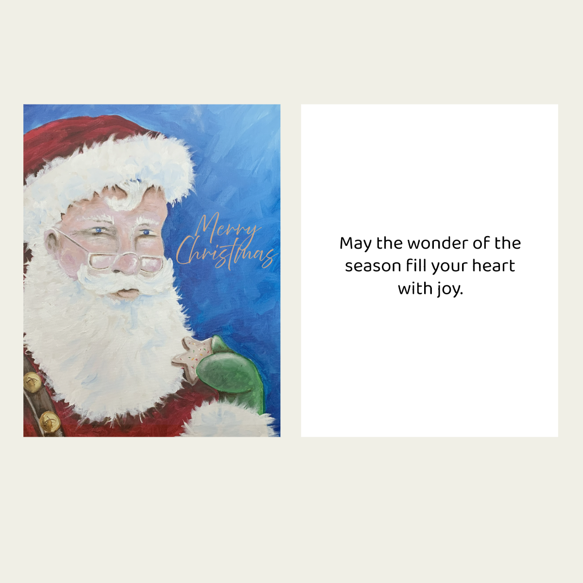 Celebrate the magic of the season with this beautifully illustrated Christmas card featuring a nostalgic painting of Santa Claus enjoying a festive sugar cookie. Full of timeless charm, this heartwarming design captures the spirit of old-fashioned Christmas traditions, making it perfect for spreading joy to all those special people in your life!