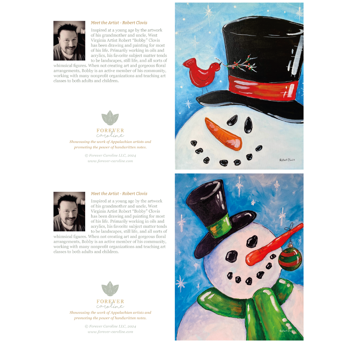 Bring joy, color, and a touch of winter magic to every message with these blank notecards featuring cheerful snowman artwork bursting with vibrant colors. Perfect for the holidays, winter birthdays, thank you notes or just-because messages, this card set features artwork reproduced from original paintings by Artist Robert "Bobby" Clovis.