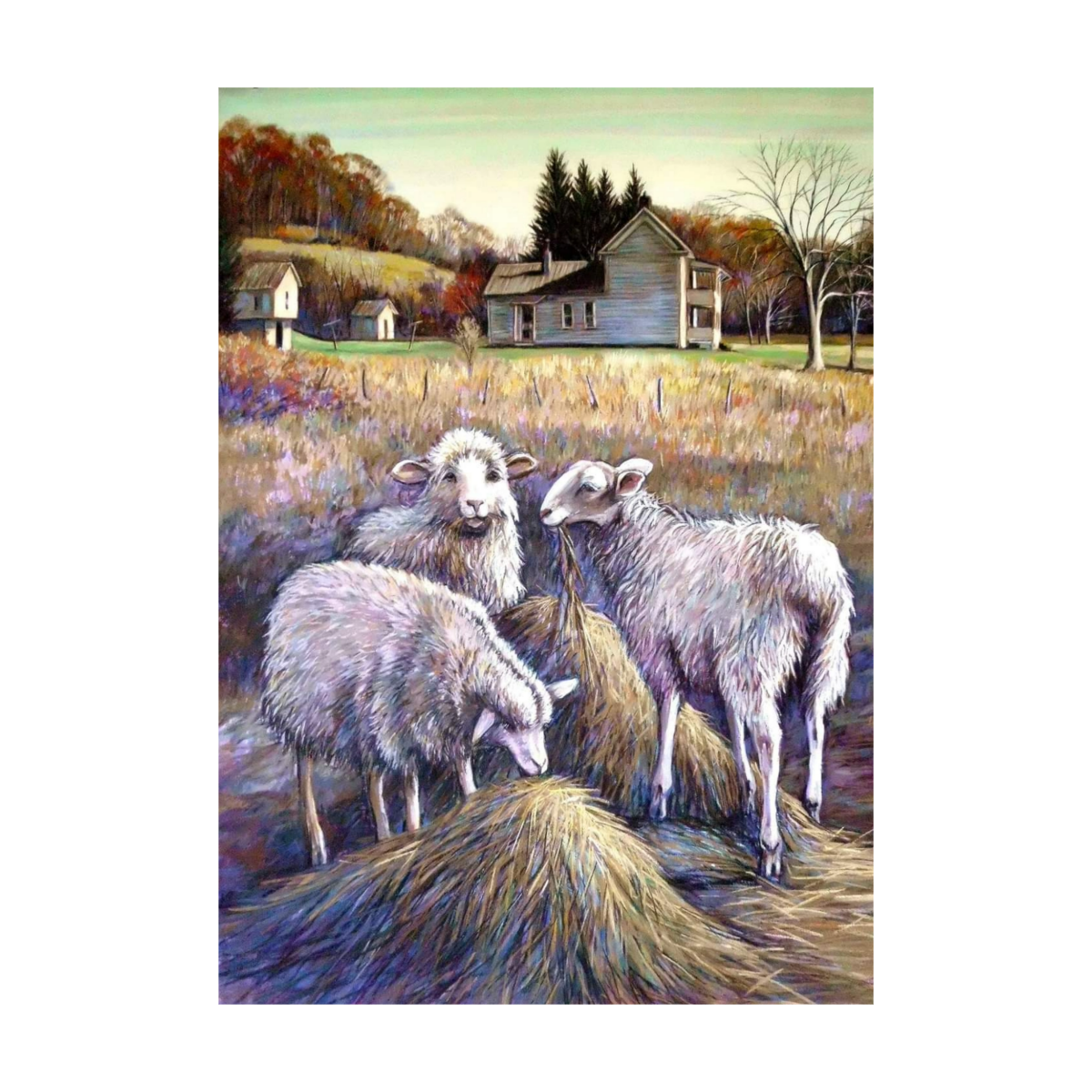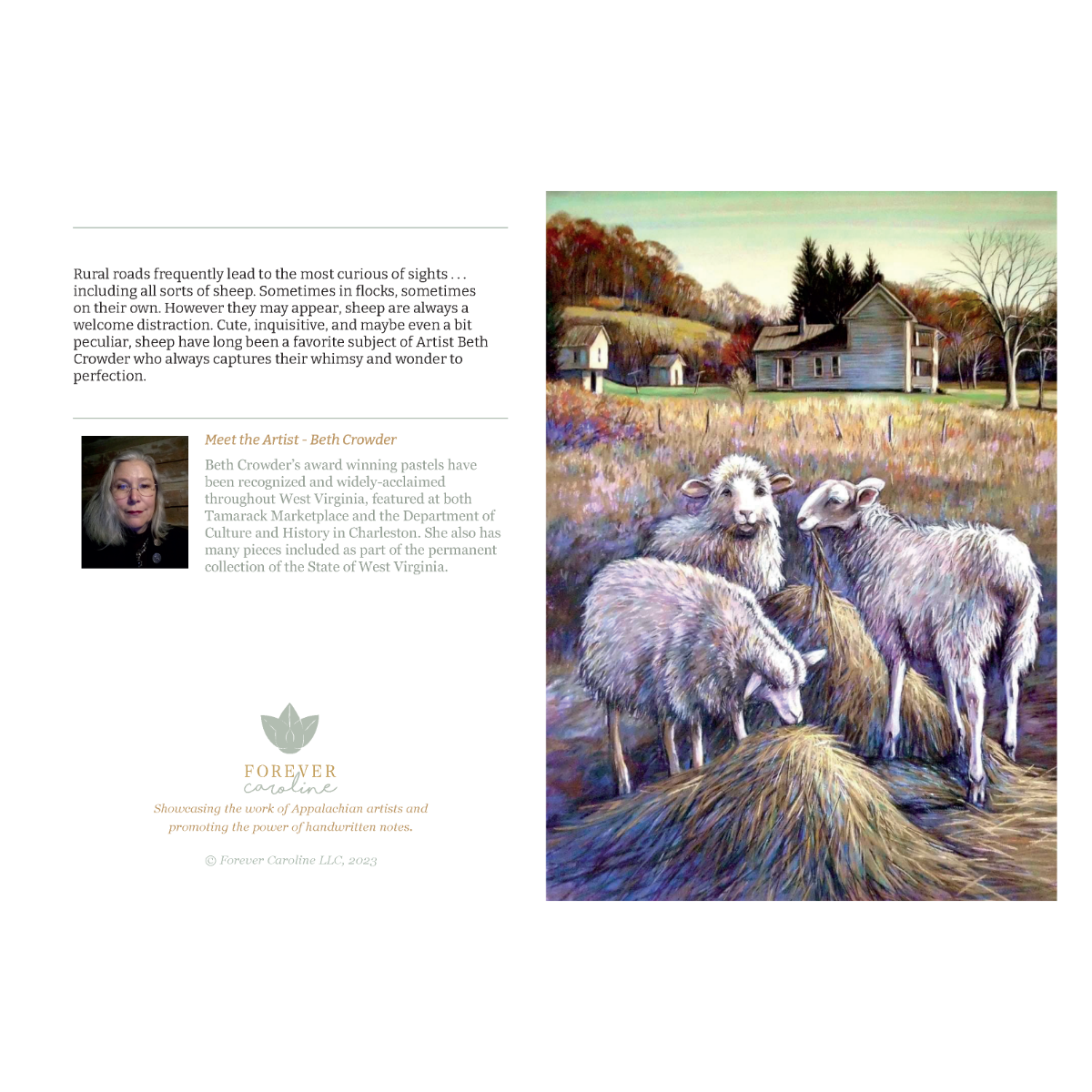Perfect for framing or sending to family and friends with thinking of you, thank you, get well or birthday messages, this all-occasion 5" X 7" blank notecard features a reproduction of a painting featuring three sheep eating hay on a farm created by Award-Winning Sheep Artist Beth Crowder. Includes one white envelope and comes packaged in a protective resealable sleeve.
