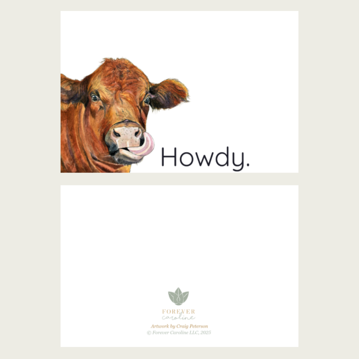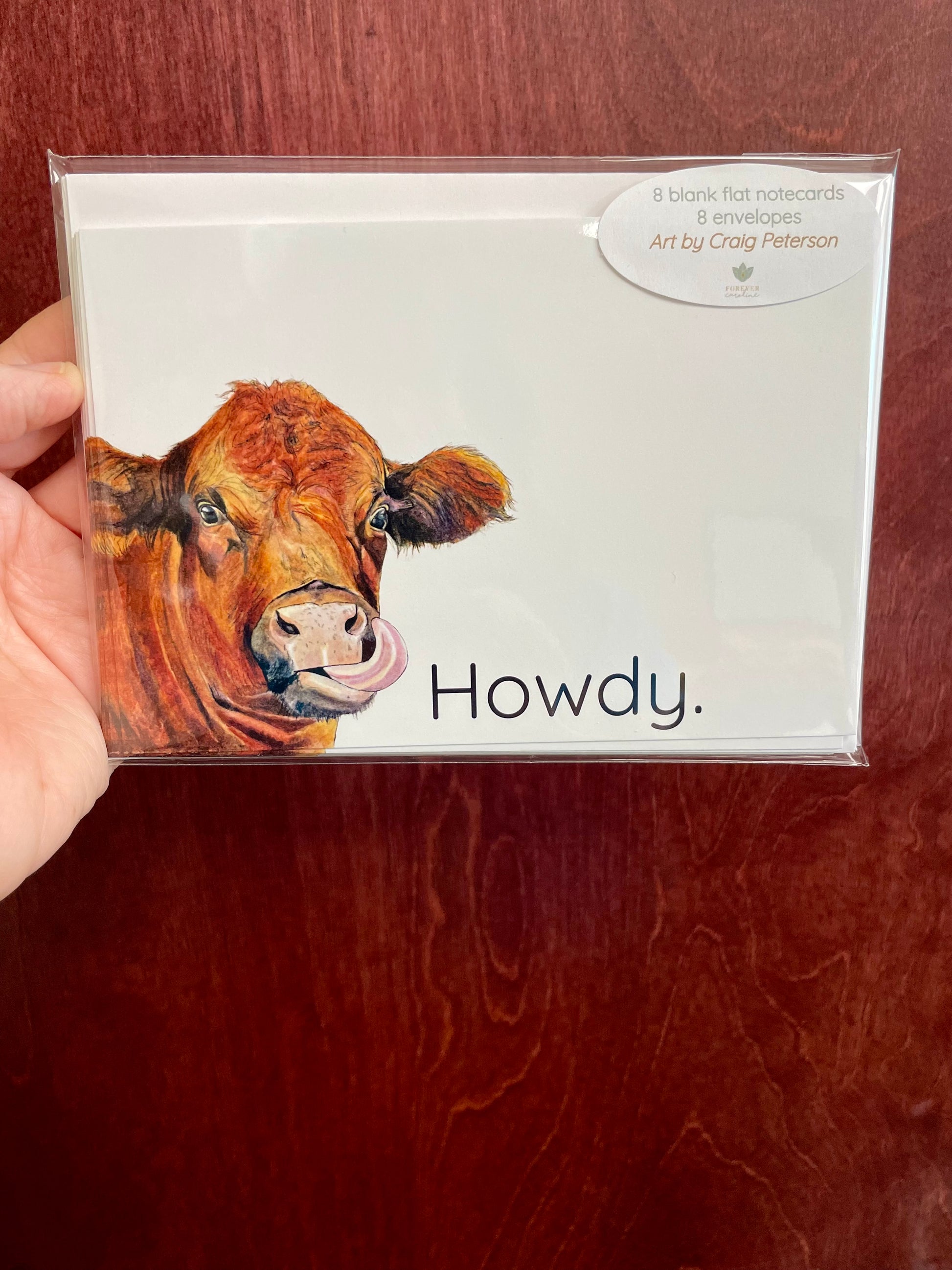 - Eight 4.25" X 6.25" flat notecards showcasing original Cow artwork and a "Howdy" message