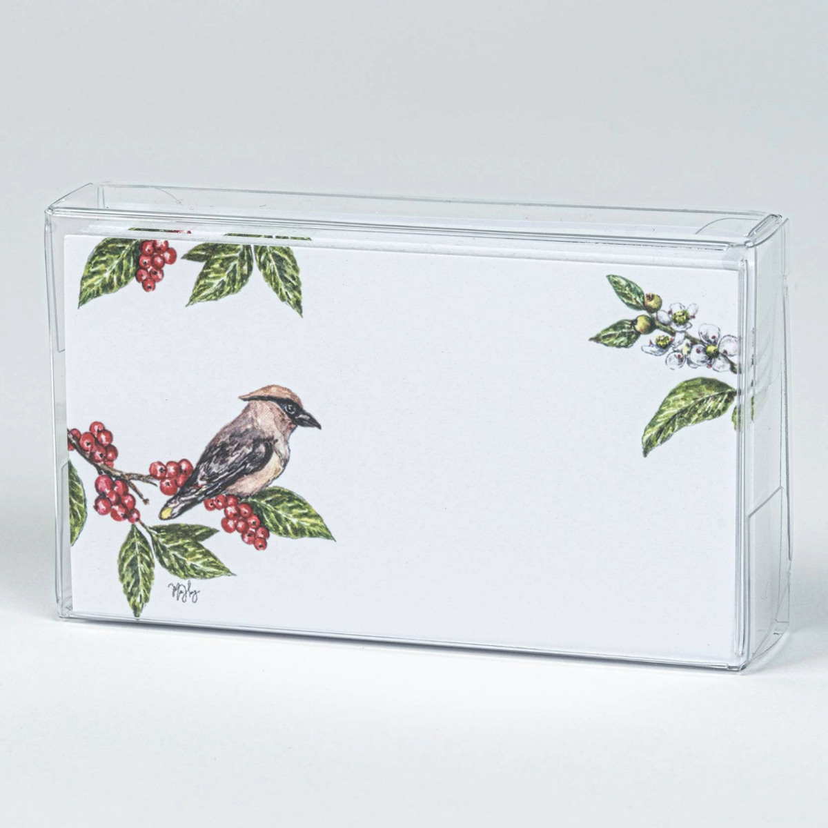 Perfect for short notes, appointment reminders, place cards, gift tags, contact cards and so much more, these 60 miniature all-occasion cards (sometimes called "lunch box notes") feature a beautiful Cedar Waxwing bird reproduced from a painting by Marianne Henning on the front. Each card is about the size of a business card (3.5'' x 2''), with a blank reverse that allows even more room for writing.