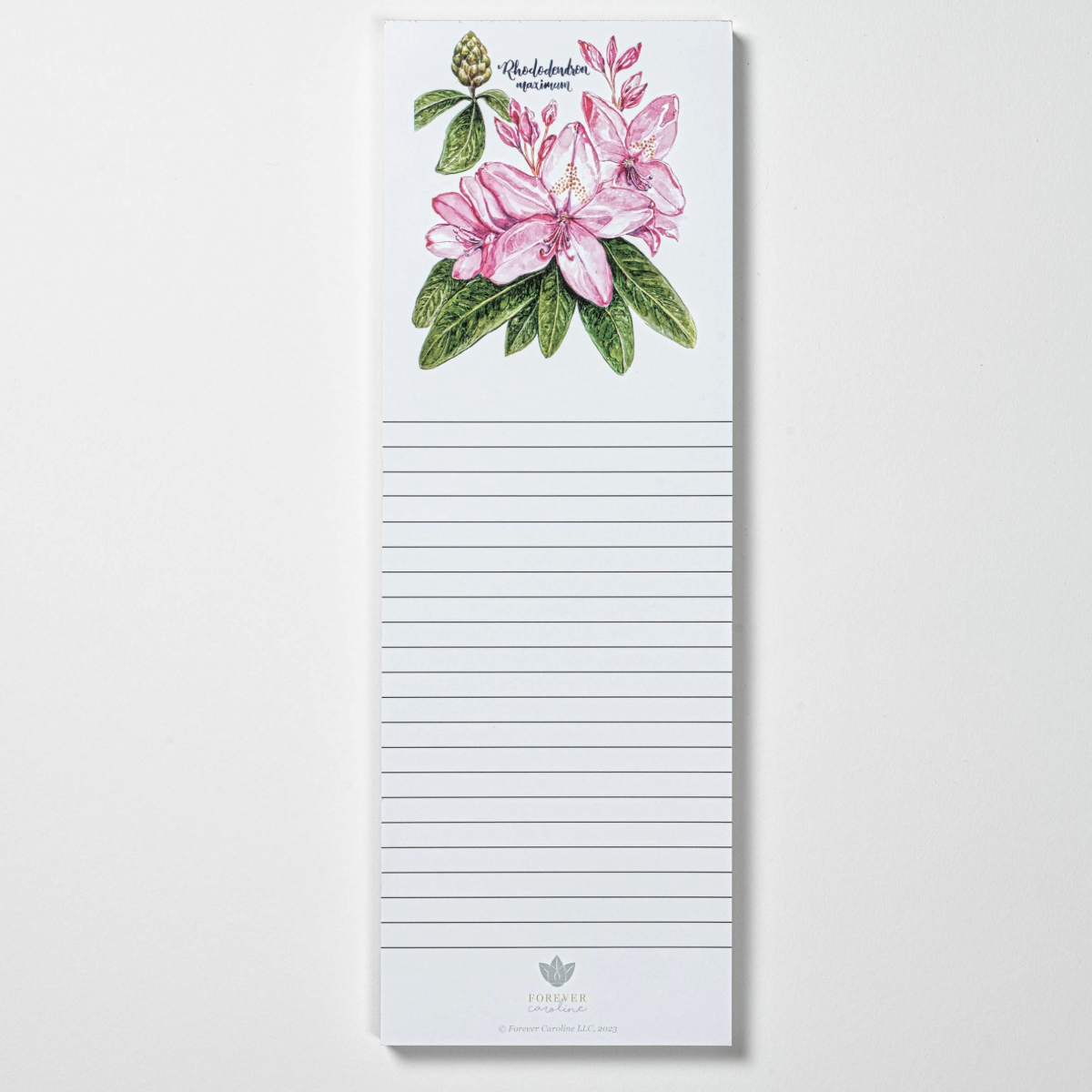 Hanging on the refrigerator using the included peel-and-stick magnet or sitting on your favorite desk or table, this generously sized lined notepad is designed to ensure that you can fully enjoy the featured Rhododendron floral artwork of Botanical Artist Marianne Henning, while also having plenty of room to make notes. It's a unique and perfect tablet for market/shopping lists, "to do" lists or just making notes.
