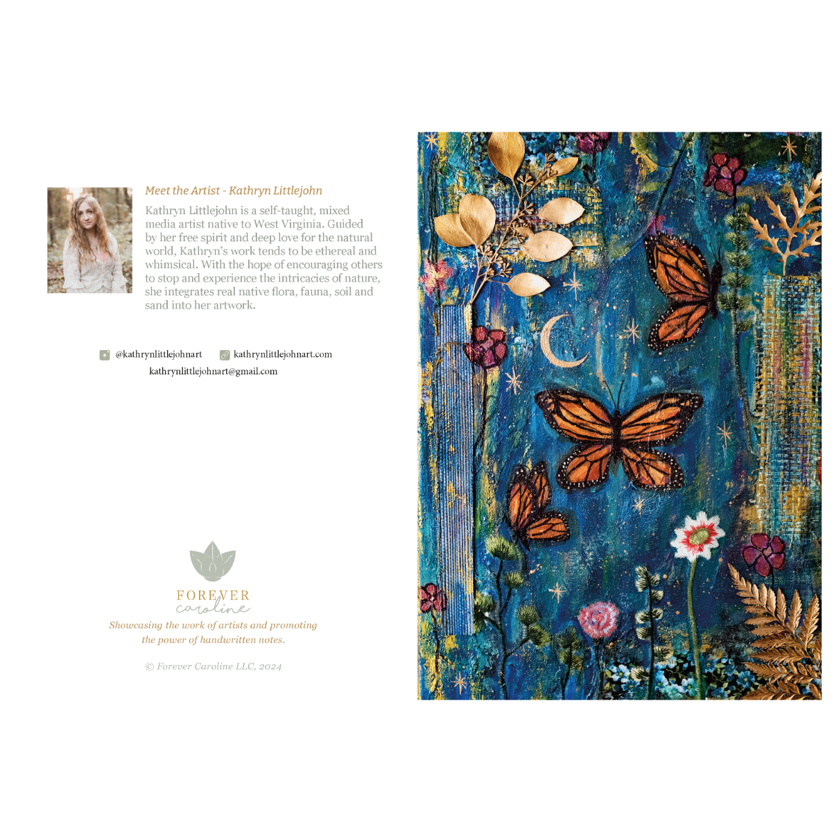 Perfect for thinking of you, thank you, get well, friendship and birthday greetings, this 5" X 7" all-occasion blank notecard features a vibrant and luxurious mixed media scene of flowers and a butterfly by Artist Kathryn Littlejohn.