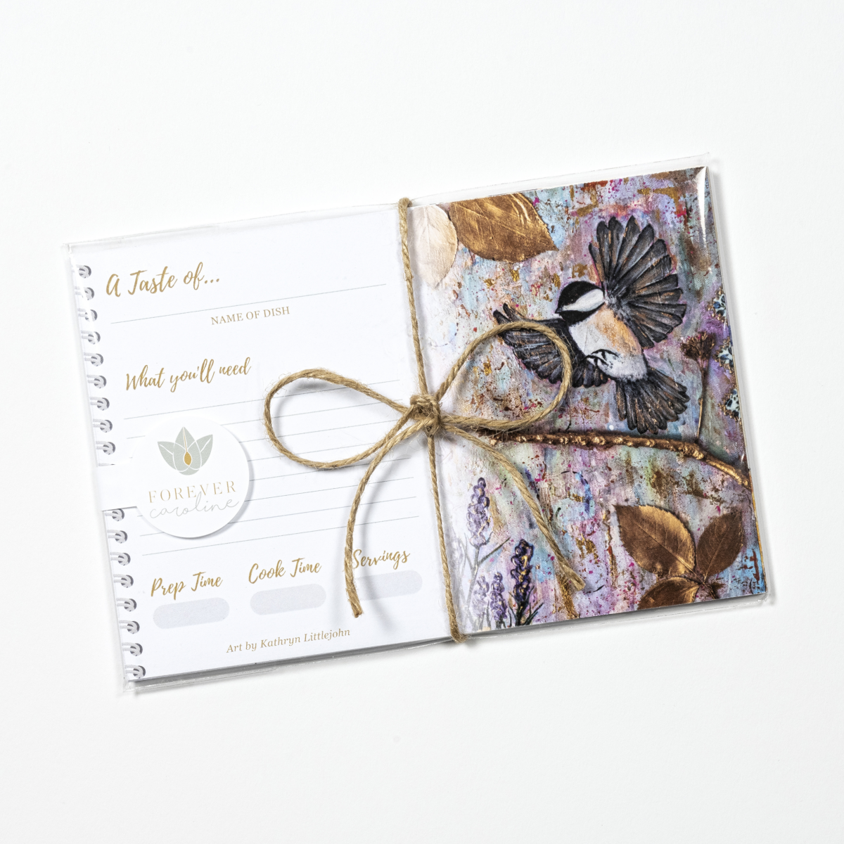 Beautiful and elegant chickadee recipe cards perfect for capturing, sharing and preserving family and friend recipes! Set of eight cards (6 inches wide X 4 inches high). Mixed media chickadee image on front and highlighted image on reverse (see photos of front and back).