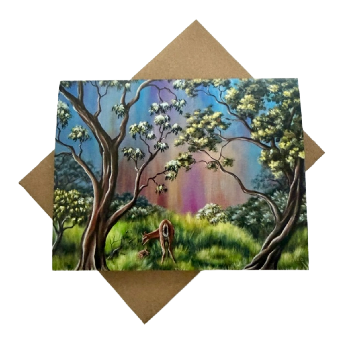 A moment of pure tenderness, captured in paint. Perfect for use as a unique Mother's Day card, but suitable for thoughtful notes year-round, this original fine art greeting card features a serene woodland meadow in full bloom — lush green grasses, flowering trees, and a sky brushed with soft blue, glowing orange, and delicate pink hues. At the heart of the scene, a protective mother deer watches over her sleeping fawn, creating a powerful image of one of life's gentle moments.