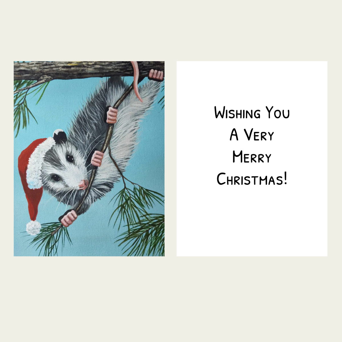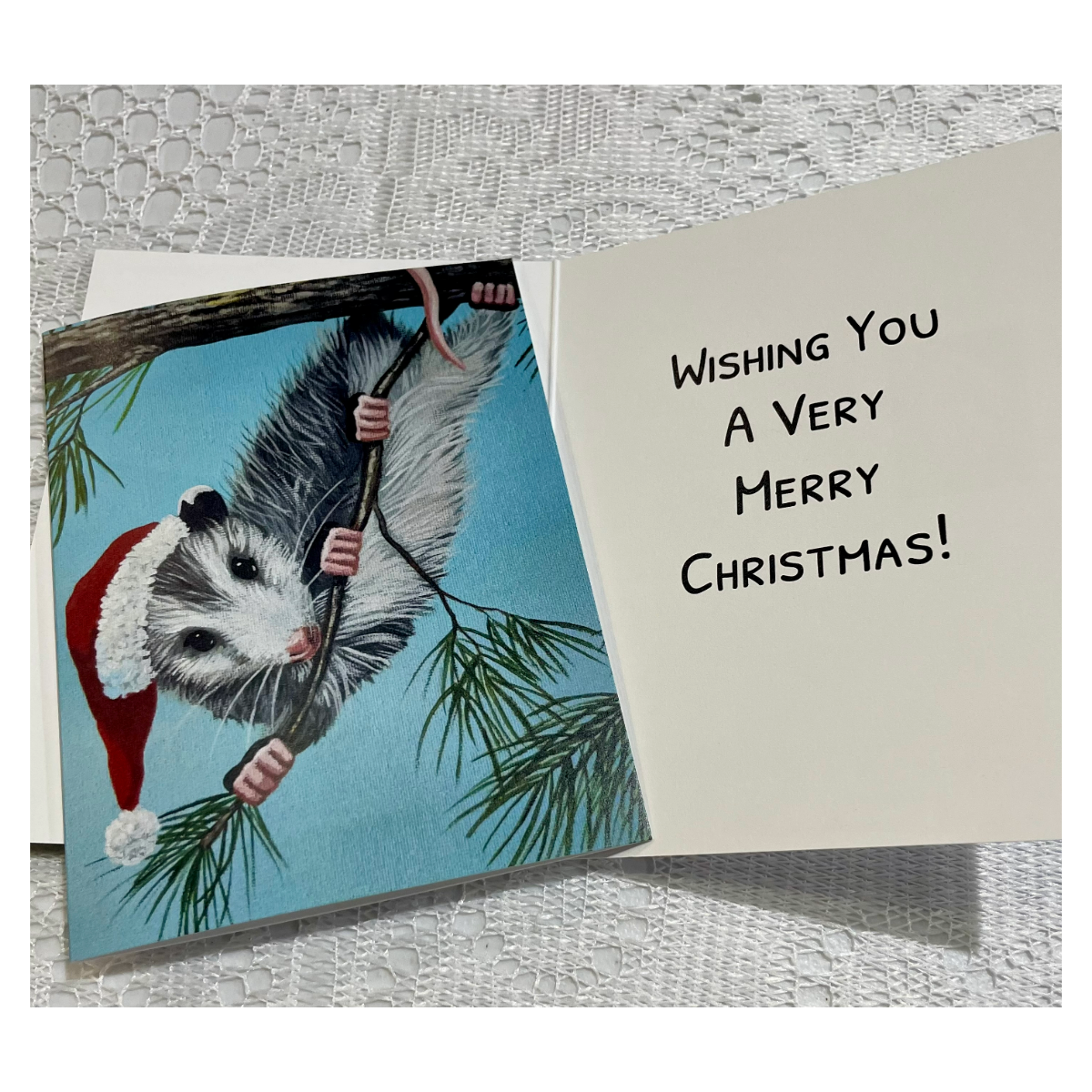 Bring a little merry cheer to the mailbox with this delightful Christmas card featuring original artwork of a festive opossum wearing a Santa hat. The inside message reads "Wishing You A Very Merry Christmas."