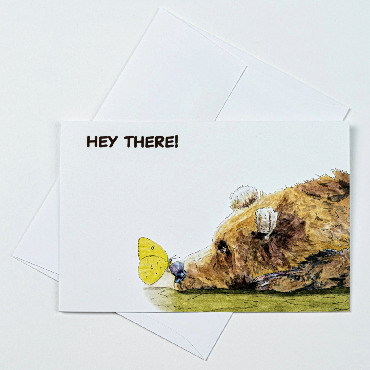 - Eight 4.25" X 6.25" flat notecards showcasing original artwork and a message of "Hey There"