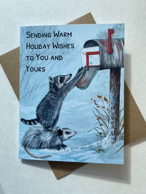 Celebrate the magic of winter and the joy of connection with this charming woodland-themed holiday card. Featuring original artwork of a resourceful raccoon standing on an obliging opossum to reach a stuffed mailbox, this card captures the warmth, whimsy, and joy of the season. Inside messages reads "Wishing you warmth, wonder, and the sweetest moments shared with those who matter most.”