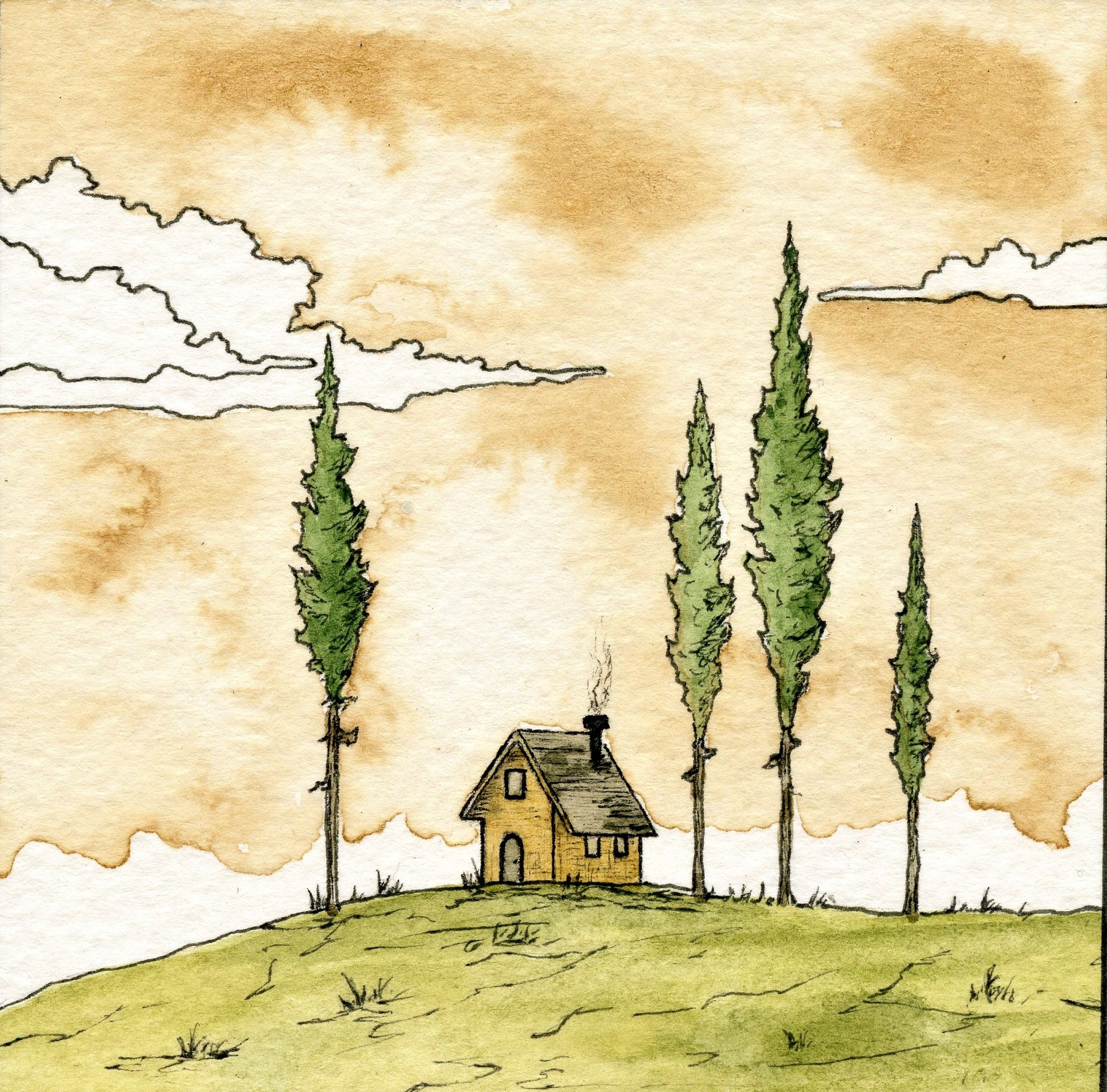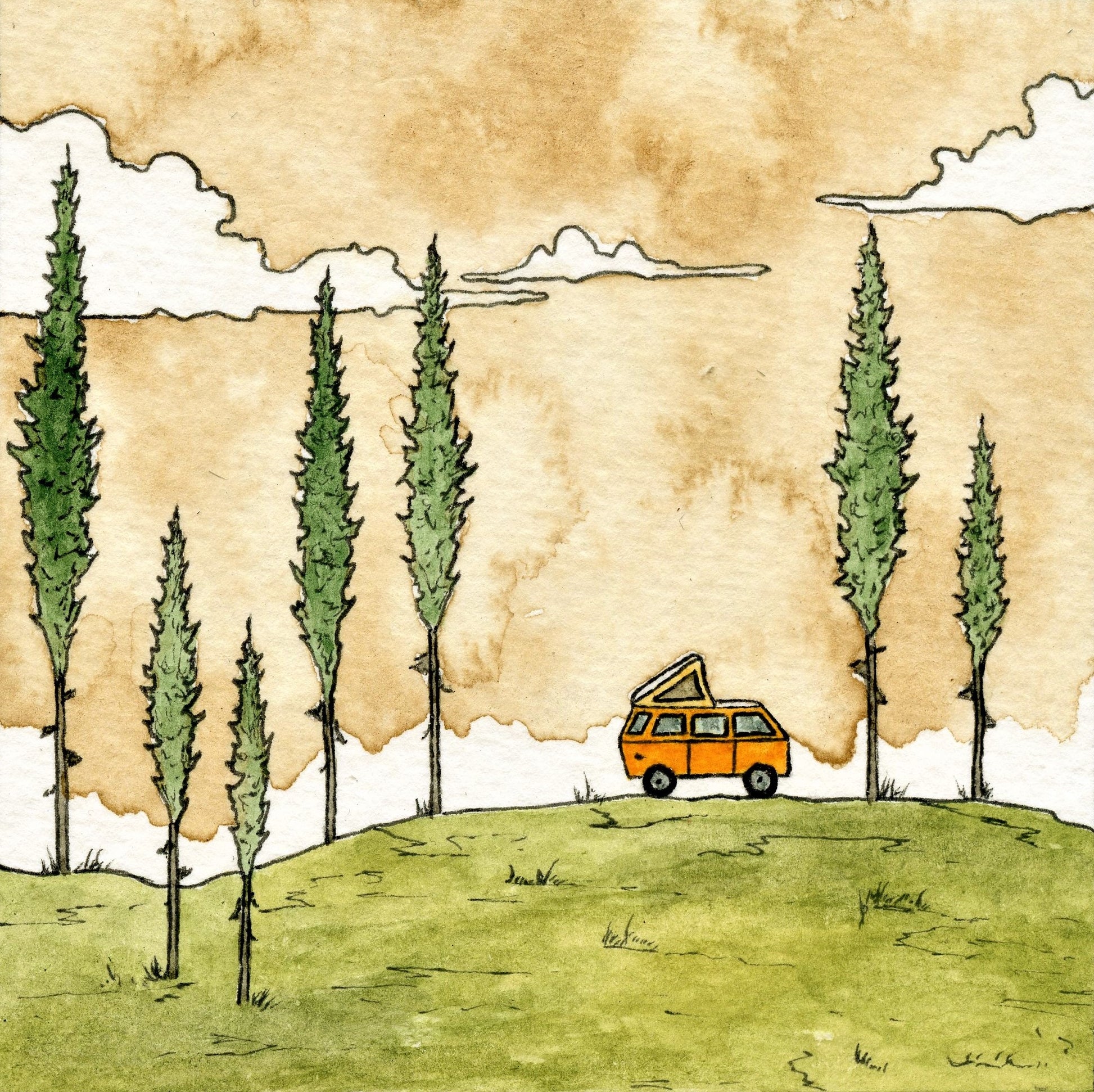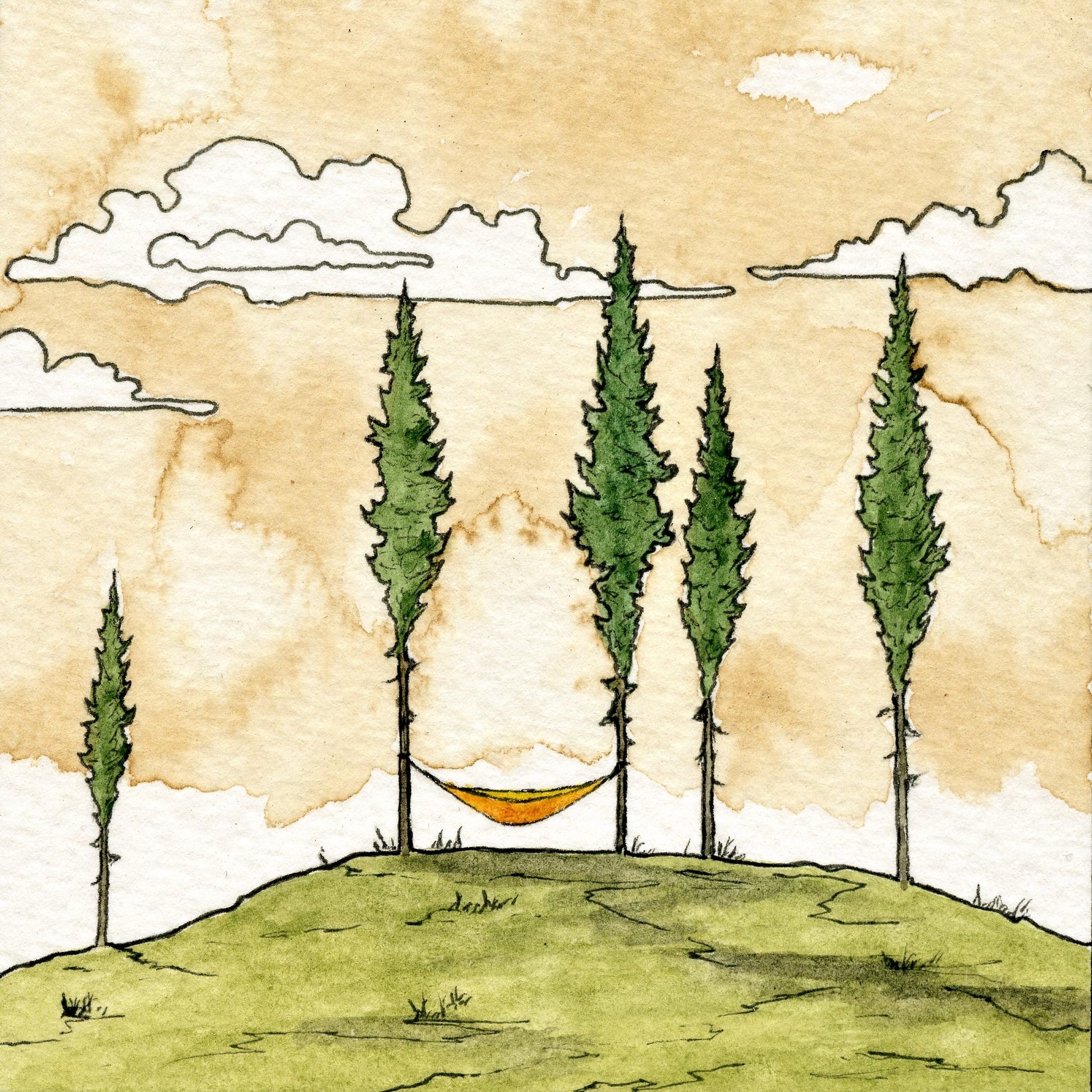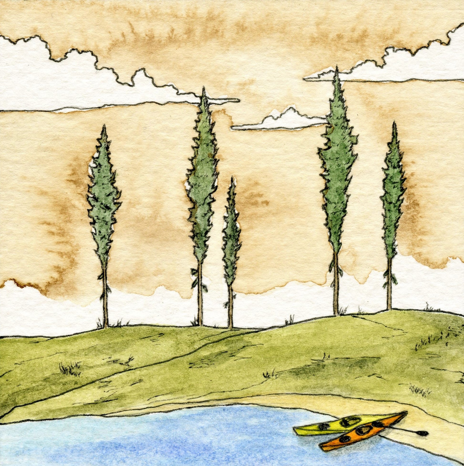 Artwork by Craig Peterson. An avid trail runner and occasional backpacker, Craig's artwork is heavily influenced by his outdoor adventures. His art is created using coffee, watercolor and pens.
