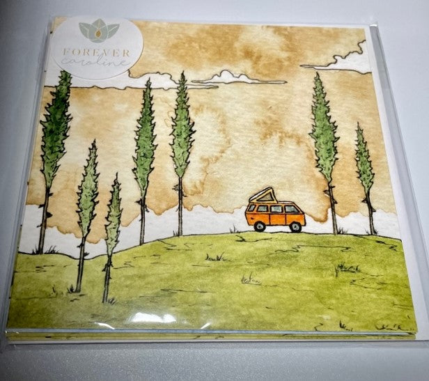 Perfect for birthday, thinking of you, thank you, get well and friendship messages for your favorite camper or outdoor enthusiast, these four all-occasion blank 5" X 5" notecards feature scenes of outdoor adventure activities. Images include a camper van, cabin, hammock and kayak by the lake. Each scene originated as a painting on canvas, which also makes them perfect for framing as art prints.