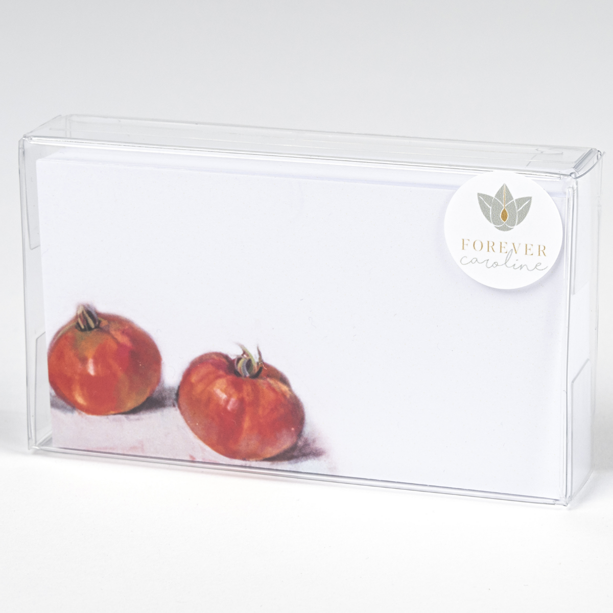 The notecard set includes Four Blank Notecards (4.25 X 5.5 inches) featuring four still life images of tomatoes (see package label showing the four images).