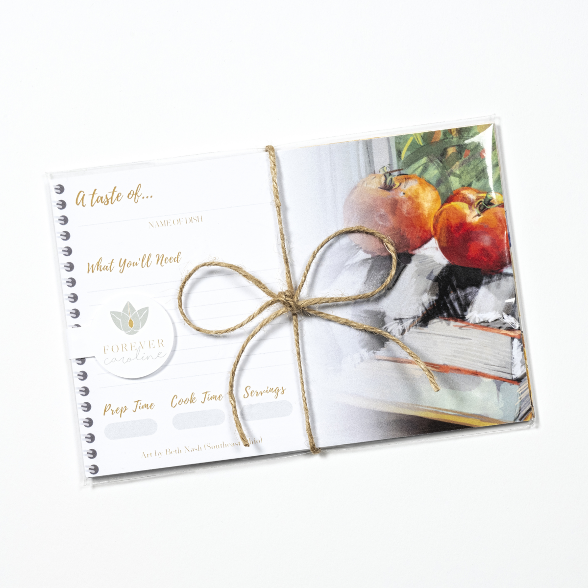 The recipe card set includes eight recipe cards (6 X 4 inches) with one image on the front of each card and a highlight image on the rear (see photos of front and rear). The set of cards is packaged in a plastic sleeve wrapped in a strand of twine.