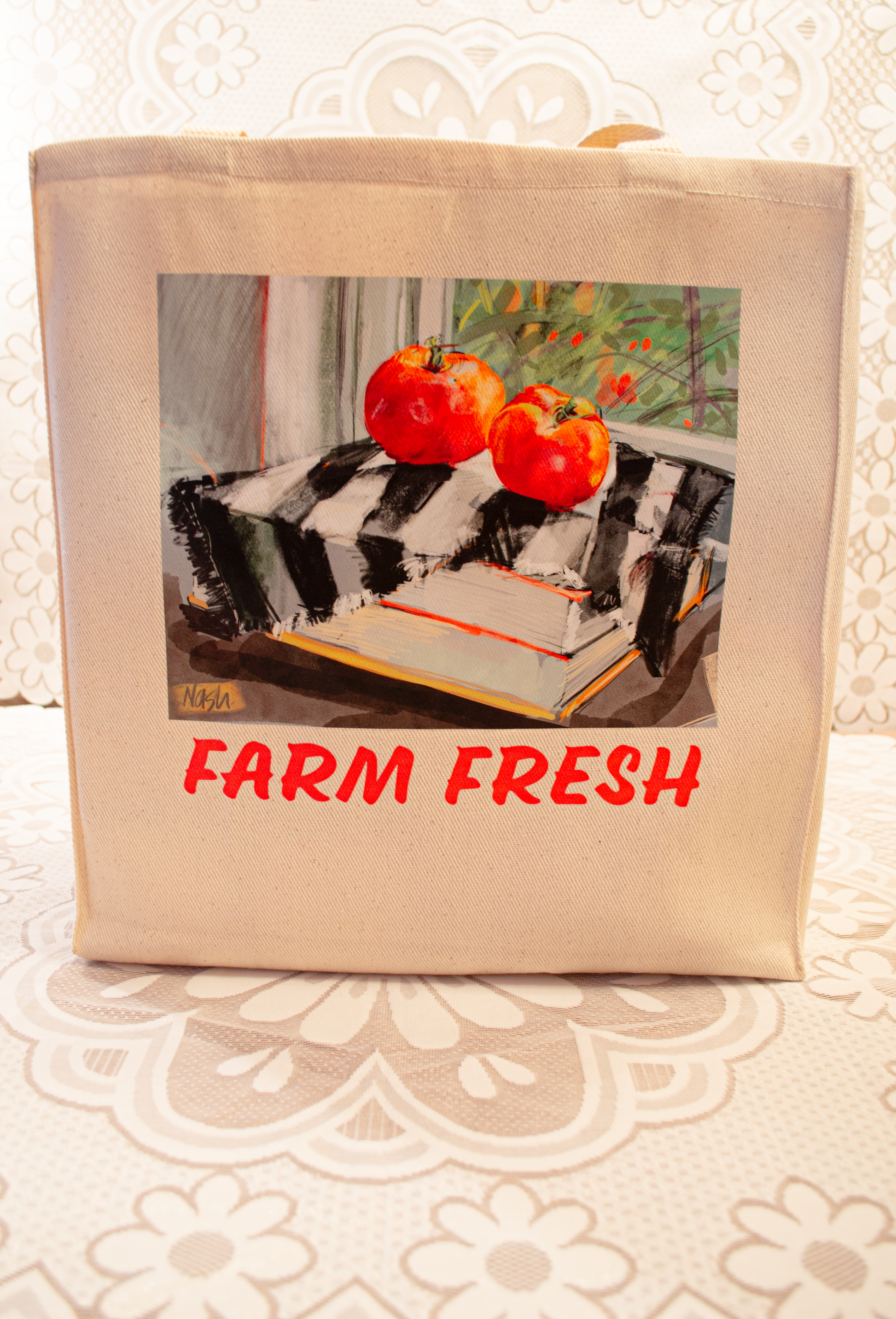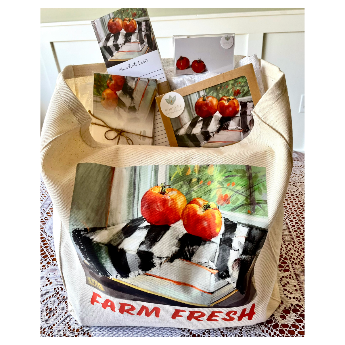 Harvest time bestows the beauty of ripe tomatoes, especially on kitchen tables and windowsills. In this still life image, Artist Beth Nash captures the abundance of the harvest and the joy it brings to homes and families. Tomato lovers will enjoy this market bag gift collection including FIVE products for a special combo price!