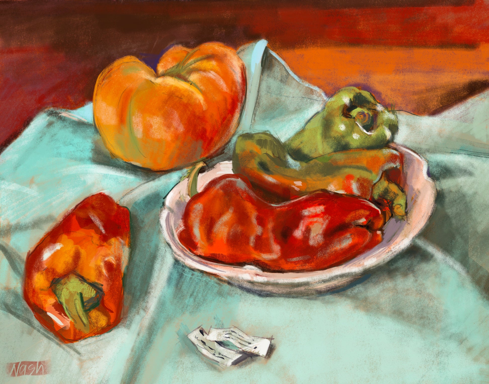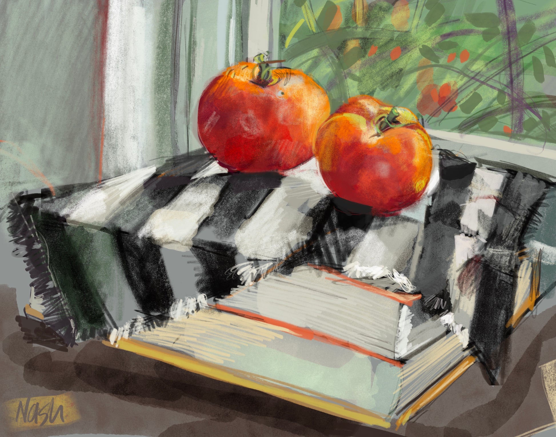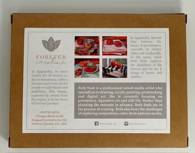 In Appalachia, harvest time bestows on us the beauty of ripe tomatoes, especially on kitchen tables and windowsills. In this still life series, Artist Beth Nash captures the abundance of the harvest and the joy it brings to homes and families.