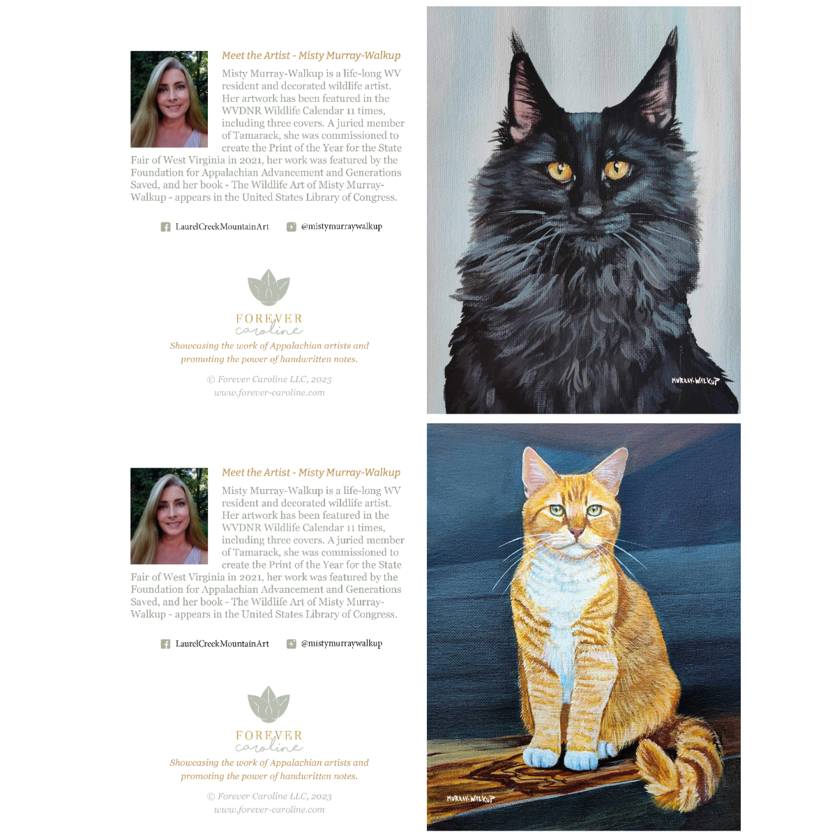 Perfect for birthday, thank you, thinking of you, get well and friendship messages, these four whimsical 4.25" X 5.5" blank all-occasion notecards feature two fun cat images (two cards of each image) reproduced from the paintings of Award-Winning Wildlife Artist Misty Murray-Walkup. Includes four envelopes.