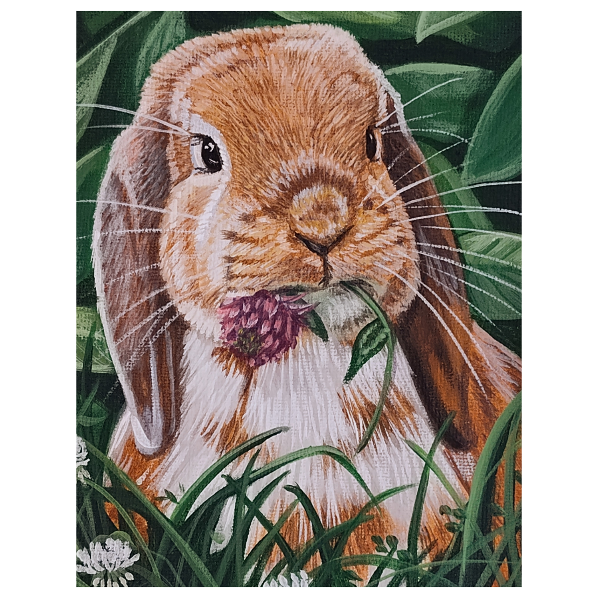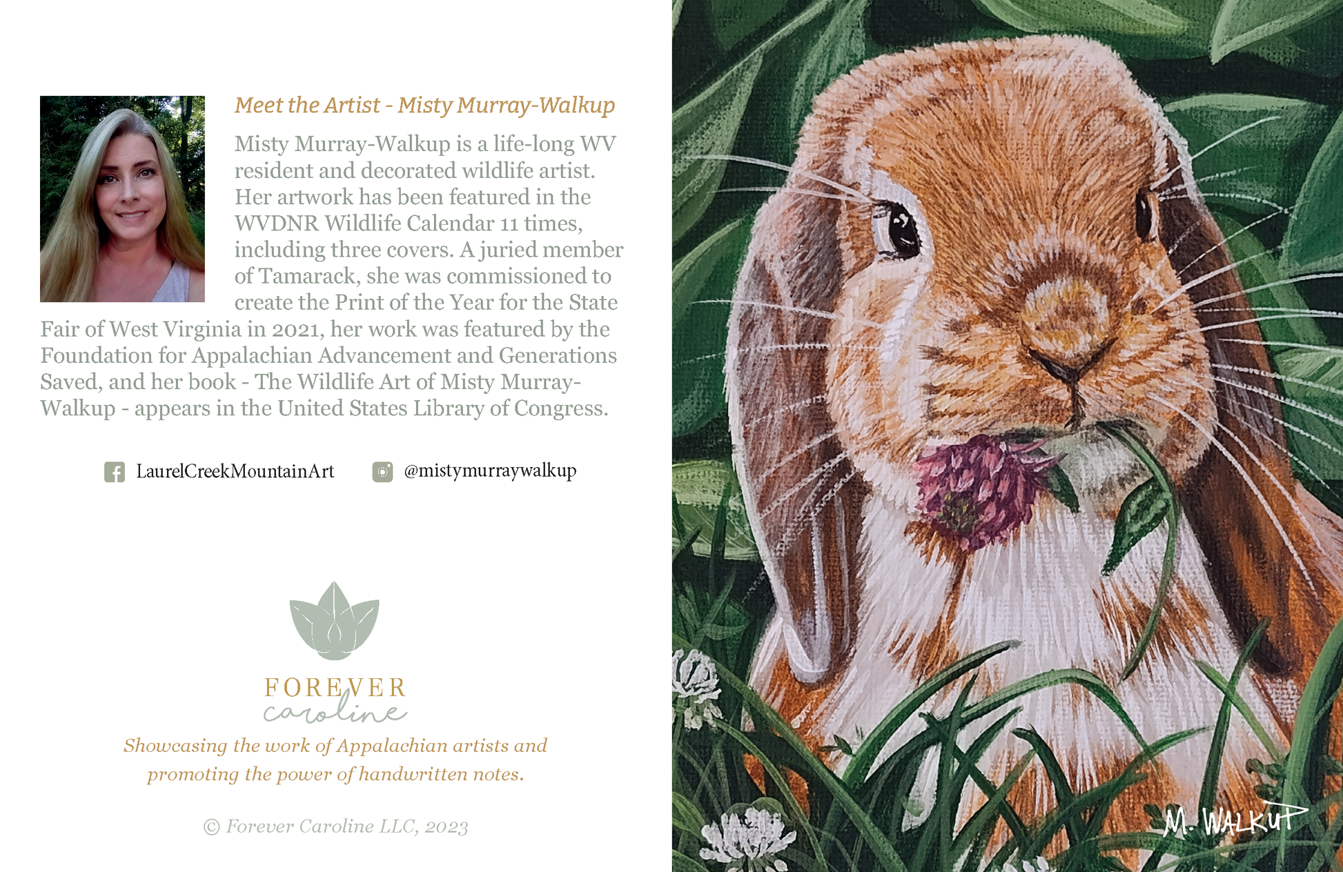 Perfect for Easter, thinking of you, thank you, get well, friendship and birthday messages, this 4.25" X 5.5" blank all-occasion notecard features a cute floppy-eared rabbit image reproduced from a painting by Award-Winning Wildlife Artist Misty Murray-Walkup. A photo and bio of the artist are featured on the rear of the card.