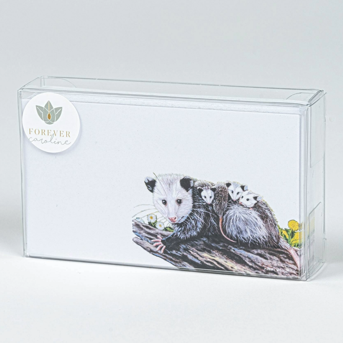 Bring charm and personality to every message with this pack of 60 tiny cards featuring an original painting of an mama opossum and her babies. Whether you're writing a quick thank you, tucking a note in a child's lunch box, adding a tag to a gift, or embellishing your scrapbook, these mini cards make a memorable impression.