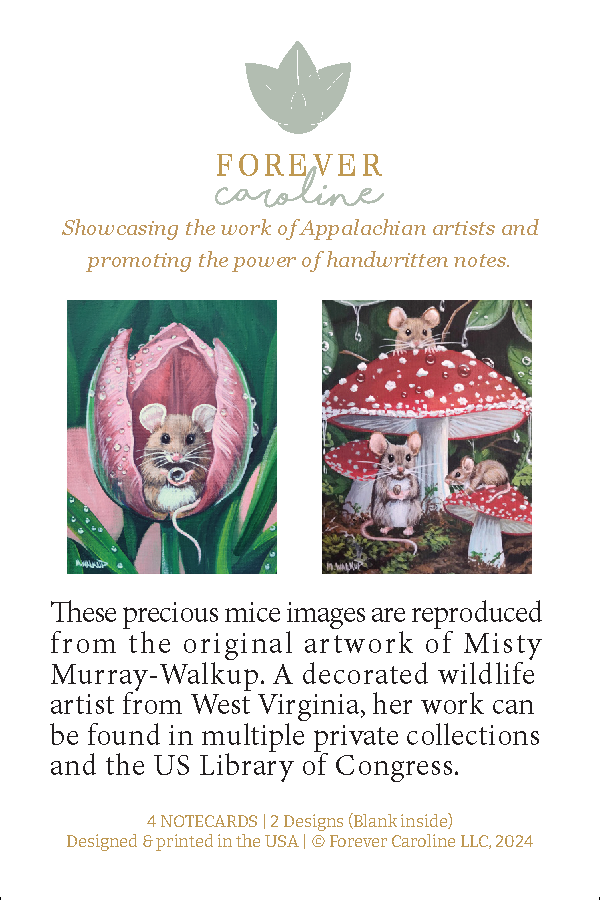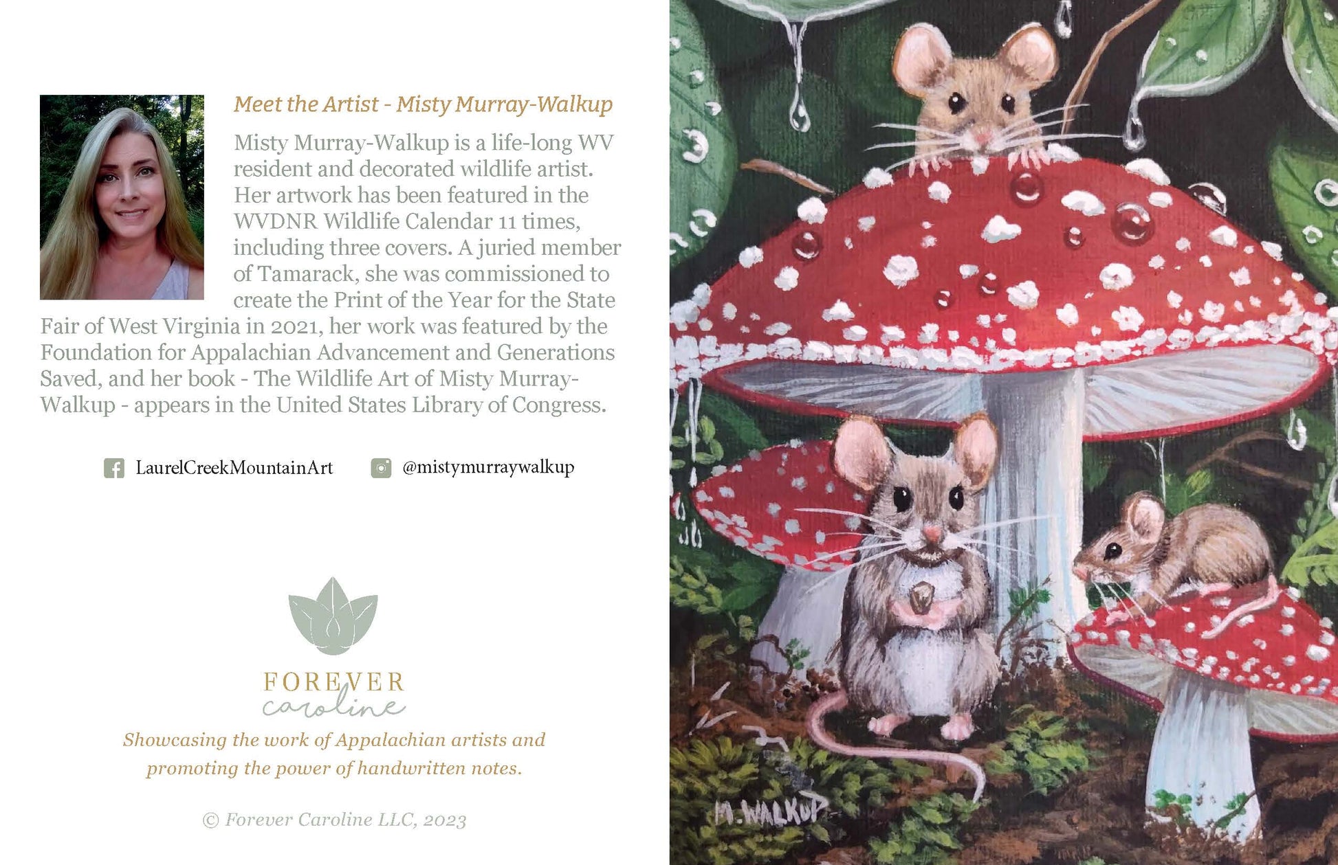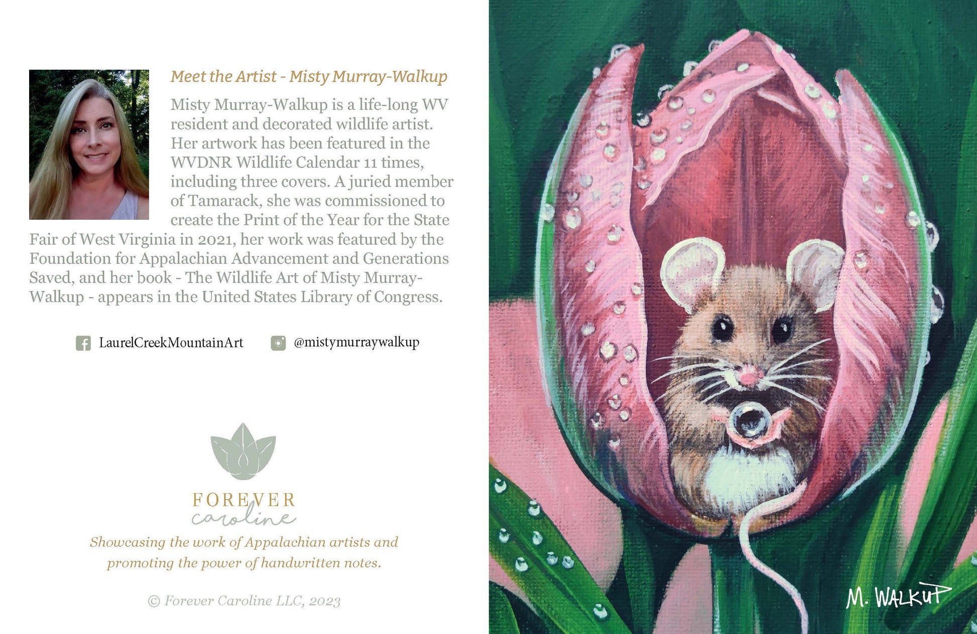 - Reproductions of two original mice paintings by Award-Winning Wildlife Artist Misty Murray-Walkup (two cards of each image)