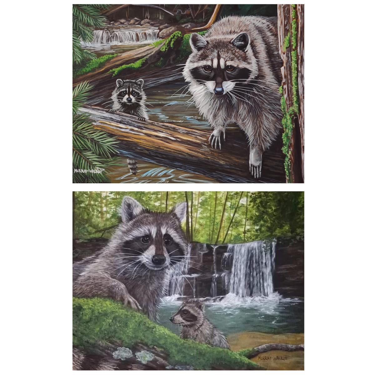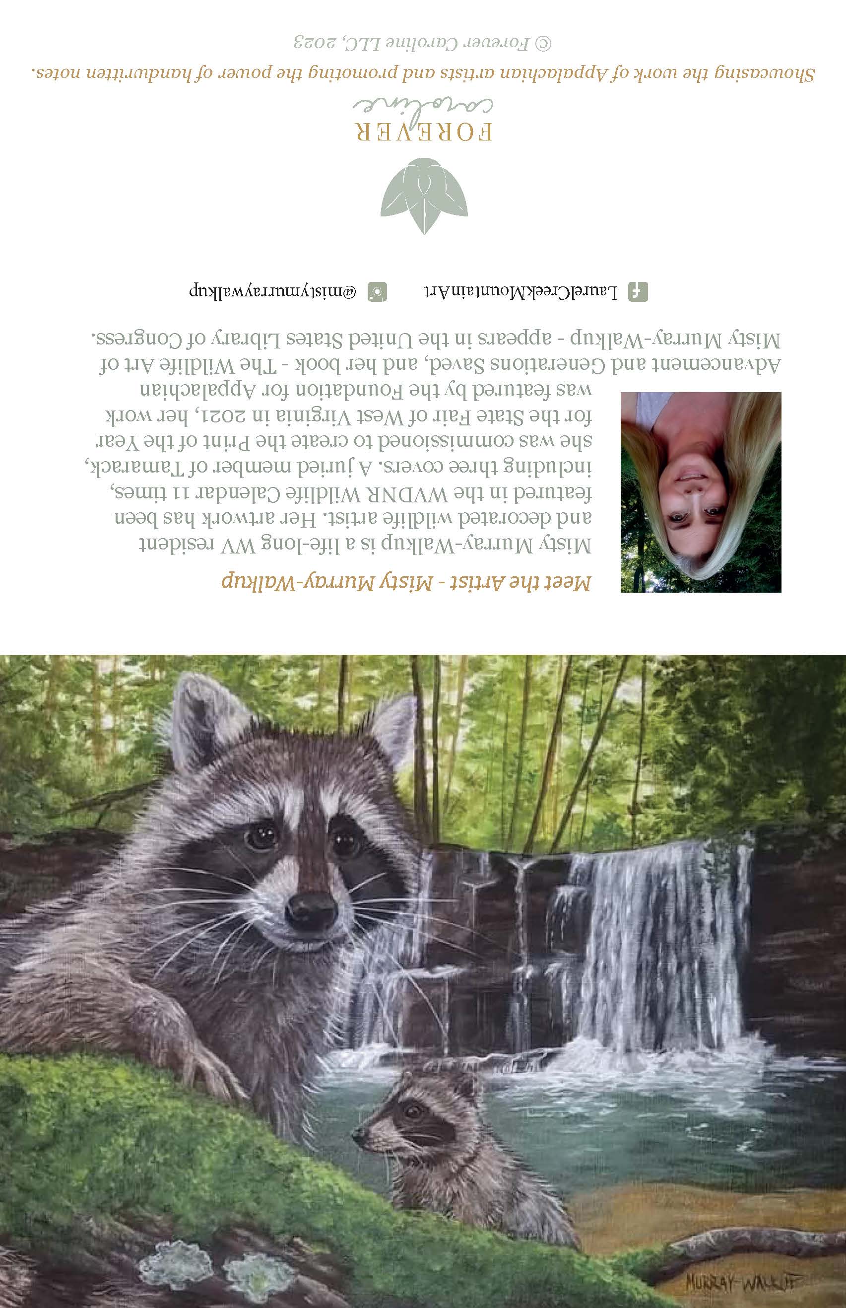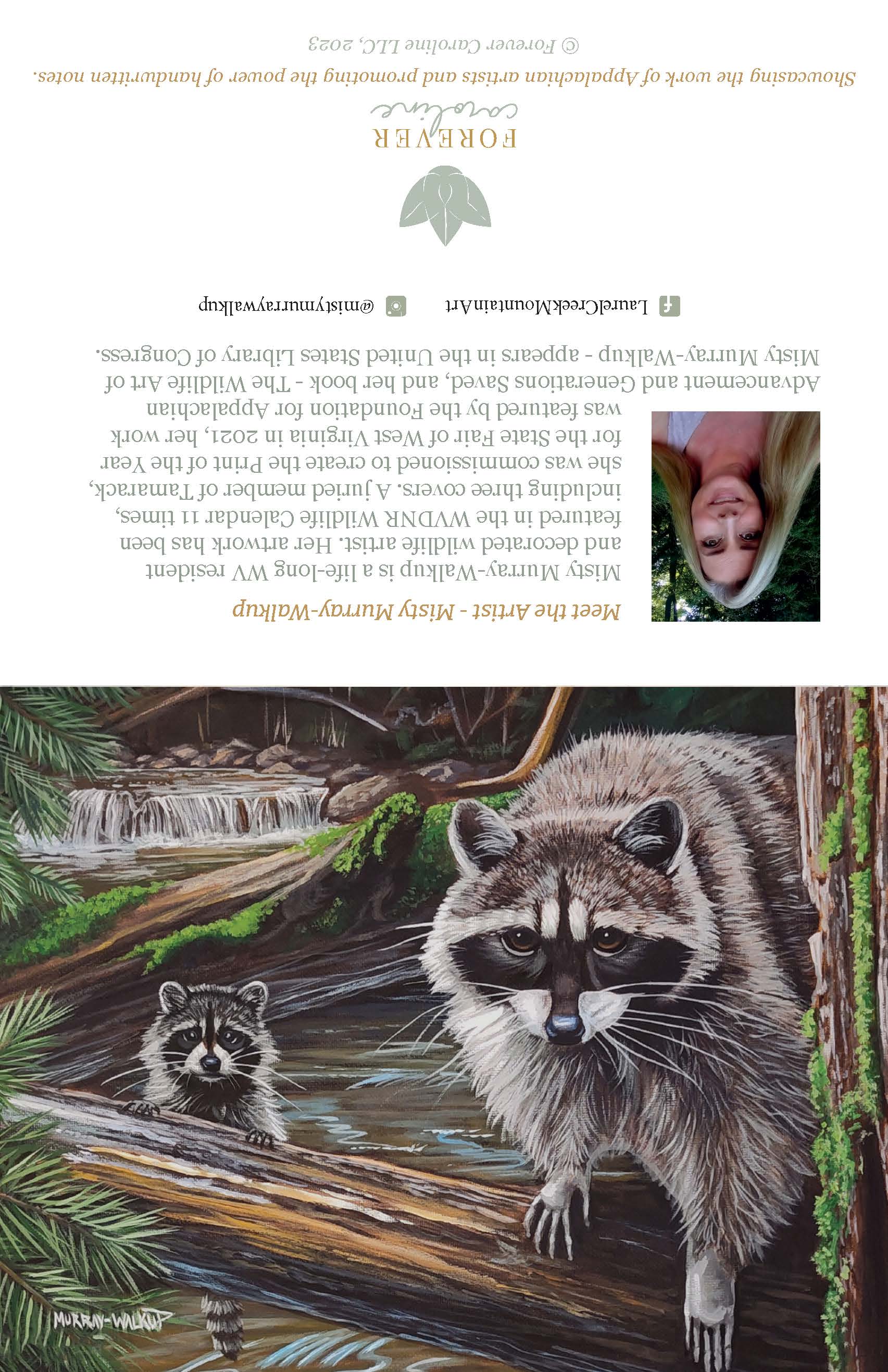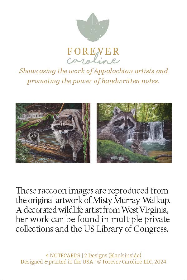 - Reproductions of two original raccoon paintings by Award-Winning Wildlife Artist Misty Murray-Walkup (two cards of each image)